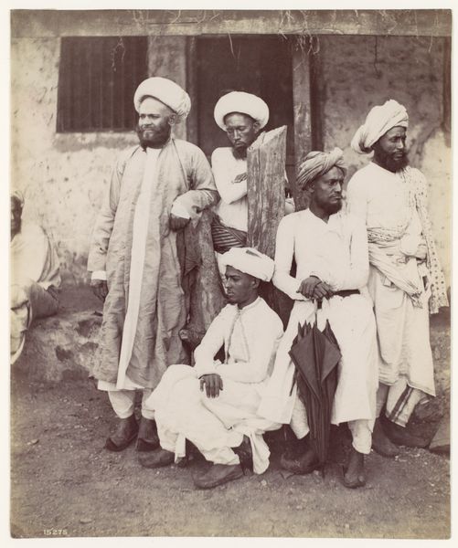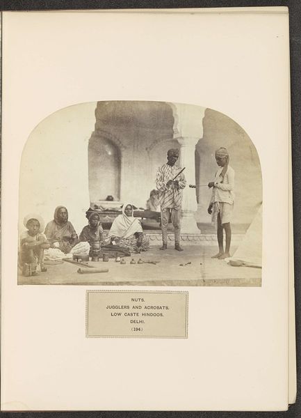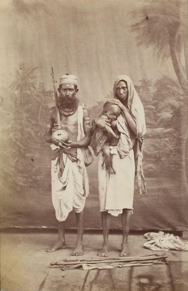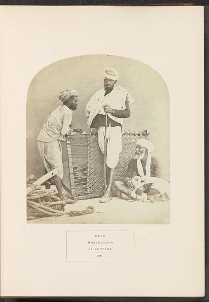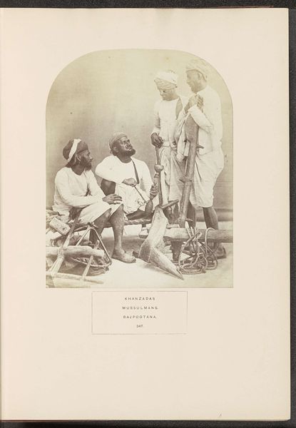 Curator: This fascinating photograph, titled "Merry Runners" by G. Lékégian, presents two figures in what appears to be a moment of quiet exchange. I'm immediately struck by the stark contrast of light and shadow. Editor: Indeed. But let’s consider the caption. The "Merry Runners" are clearing the path for royalty. This image isn’t merely about aesthetics; it speaks to colonial power dynamics, doesn't it? These men, likely forced into servitude, facilitate the movement of privileged classes. Curator: I concede that the social context is critical to a full understanding. However, I am also drawn to how Lékégian uses the verticality of the spears and the wheel's circular form to create a balanced composition. The subjects are carefully framed. Editor: Balanced, yes, but within a system that inherently lacks equilibrium. The runners’ bare feet, their simple attire...It's a visual reminder of the disparity between the carriers and those they carry. This photograph isn't just a neutral observation; it’s a document of social inequality. Curator: A potent observation, certainly. It seems the formal qualities and historical context offer distinct, yet inseparable layers of interpretation. Editor: Precisely, and recognizing those layers allows us to engage more thoughtfully with the photograph's enduring message.
