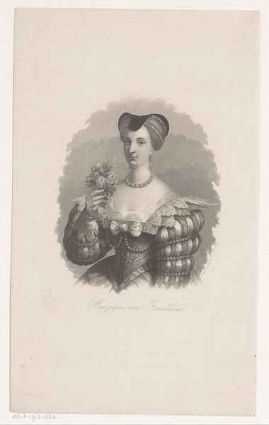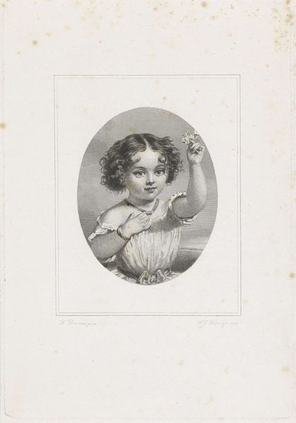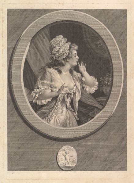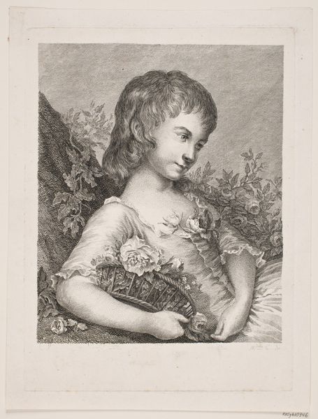 This is a print by Célestin Deshayes, made sometime in the mid-19th century. It depicts a young woman with apricots. As a print, this work is all about process. Think of the labor involved: from the initial design, to the engraving of the printing plates, to the final application of color – likely by hand, in an assembly line. This piece reflects the burgeoning industrial era, where images could be reproduced and disseminated widely. Look closely at the textures and forms achieved through the printmaking process. The fine lines create subtle gradations of tone, giving depth to the figure and her clothing. The very smoothness of the print, its capacity for crisp detail, speaks to the increasing mechanization of art production at the time. This print sits at the intersection of fine art and commercial reproduction, questioning traditional hierarchies. It prompts us to consider the social and economic forces that shaped not only the image itself, but also its accessibility to a wider audience.