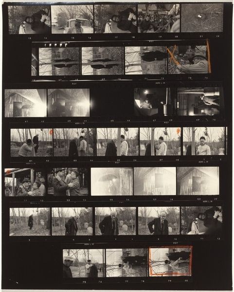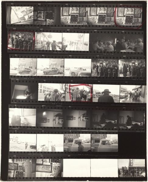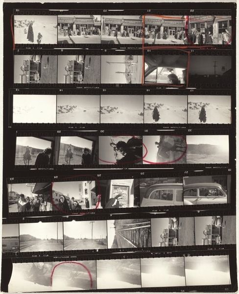 This photographic contact sheet was made by Robert Frank, and captures his journey from Los Angeles to San Luis Obispo. The material here is traditional black and white photographic film. The sheet, with its strips of images, red pencil markings, and visible sprocket holes, is raw and immediate. Frank is showing us the labor of photography itself, the editing process, and the choices made in selecting images. The journey's narrative is told through a sequence of roadside views, interiors, and intimate portraits, strung together like a visual diary. Film photography is a fascinating medium. It captures a moment, but also reveals the artist's hand in framing and selection. The darkroom process further allows for manipulation of contrast and tone, adding another layer of interpretation. Ultimately, Frank invites us to consider photography not just as a means of documentation, but as an art form shaped by human intention.