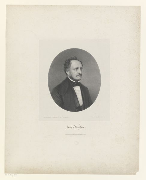 Curator: Looking at this engraving from 1874, we see August Neumann's "Portret van Friedrich von Raumer." It's a dignified portrayal, isn’t it? Editor: It is, though what immediately strikes me is its deliberate, almost academic quality. The subtle shading and clear lines suggest a methodical process, almost like a study. One wonders what kind of workshops were involved in its production? Curator: That's an excellent question! Prints like this often circulated widely. Consider the social role: Raumer was a historian, so this image likely served to disseminate his image and ideas within academic circles, maybe even reinforce a particular public persona. Editor: Precisely! The choice of engraving, too. The material and reproductive capabilities afforded accessibility and reach, impacting cultural consumption beyond an elite viewership. We also need to think about the engraver’s labor; who were these people and how did they affect the print’s message through their handcraft? Curator: A fascinating point. And let's not forget how the format contributes. It almost suggests a carte de visite or a printed photograph used to represent the likeness and status of a prominent figure. Editor: And that brings up its politics; such prints allowed political thinkers and leaders to cultivate their public image—what can we tell from Raumer's clothing, pose and stern look about the values the print sought to impart onto his admirers? Curator: Well, his clothing does scream gravitas—a sombre suit, precise bow tie, an air of authority that transcends the mere individual. But look closely at how Neumann, or more probably, the atelier responsible for the print, employs subtle textural details. The lines of his jacket versus the background contribute to the air of accessible authority... Editor: Indeed, and that speaks to the power and potential constraints placed on laborers, artists, artisans and their work at this particular historical and cultural conjuncture... So this engraving embodies a complex dance among individuals involved, processes, material affordances and symbolic communication. Curator: Absolutely. It truly encapsulates the dynamic interchange that exists between an image and its many layers of societal context. Editor: Thanks to that nuanced texture, the careful craft, and its fascinating historic resonance, I’ve been forced to look closer than I’d intended at the labor, artistry, and context that shaped this engraving, August Neumann’s "Portret van Friedrich von Raumer."
