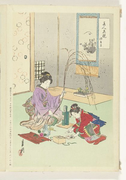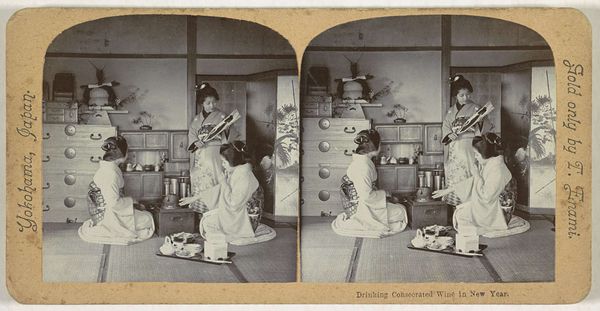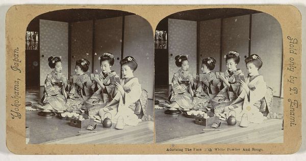 Editor: This is "Theeceremonie met drie vrouwen", or "Tea Ceremony with Three Women," taken sometime between 1900 and 1907 by T. Enami. It's a hand-colored photograph printed on paper. What strikes me is the quiet formality – a glimpse into a serene, private ritual, almost frozen in time. What do you see in it? Curator: Frozen indeed. For me, this piece whispers stories. Imagine slipping into this world – the soft rustle of kimonos, the delicate clink of porcelain, the almost palpable steam rising from the tea. Enami captured a real cultural fascination with Japan at the time, now called Japonisme. A true window into a world viewed with romantic, idealized lenses! Does the careful arrangement of objects mean something more, do you think? Editor: Possibly! It makes me wonder about the audience Enami was trying to reach, like were these meant to appeal to western tastes at the time, portraying an exotic and controlled version of Japanese life? Curator: Exactly! They weren’t merely documenting a scene; they were carefully staging a tableau for consumption. But in that staging, perhaps there’s also a kernel of truth, a yearning for that serene beauty in a rapidly changing world. Like a fleeting dream of simpler times! And who doesn't crave simpler times? Editor: That's a beautiful thought. I’m starting to see it as less of a posed shot, and more like an aspirational vision. Thanks, I learned a lot about staged photography from the period, so I appreciate your perspective. Curator: Anytime! Maybe next time, tea's on me – though I can't promise a geisha.