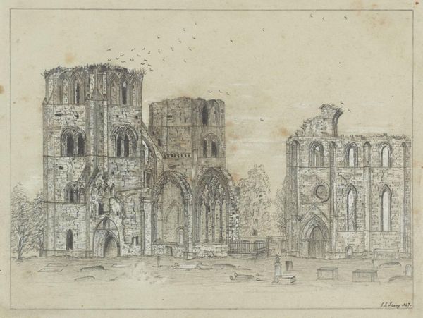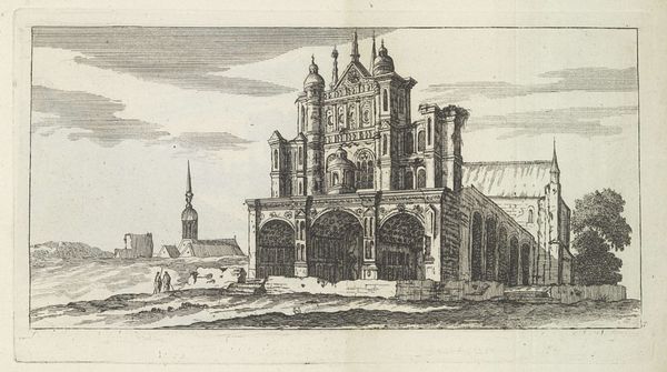 Curator: This is Thomas Higham's rendering of the Church of Saint Jacques in Dieppe. Note the architectural detail, the fineness of line in the engraving. Editor: It's incredibly evocative, almost dreamlike. The church looms, a symbol of enduring faith amid the bustle of everyday life. Curator: Precisely. The density of the facade, those repeating gothic arches—they create a powerful visual rhythm. Observe also the contrast between the ornate structure and the simplicity of the figures below. Editor: Those figures draw the eye, anchoring the church in lived experience. It's a testament to the enduring power of religious spaces, drawing communities together. Curator: The artist's focus on texture and form lends the building a monumental quality. Editor: It's more than that. The image is a vessel of cultural memory, holding centuries of worship and communal identity. Curator: Indeed, there's a compelling interplay between representation and symbolic weight. Editor: The power of enduring symbols laid bare, wouldn't you say?