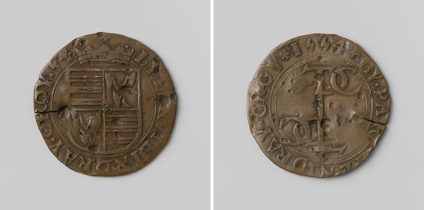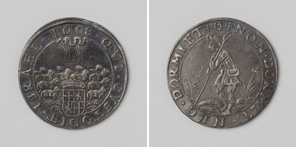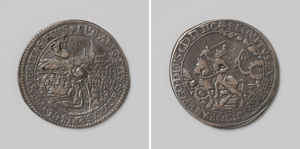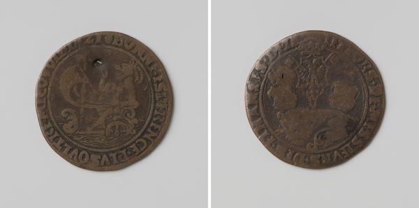 Editor: Here we have an engraving called "Dankdag op het vergaan van de Spaanse armada", commemorating the defeat of the Spanish Armada in 1588. It’s dated 1591 and rendered in bronze relief. The level of detail in such a small space is amazing, and creates an atmosphere of quiet, steely strength. What elements of its design stand out to you? Curator: Note first the bilateral symmetry of the entire piece. Consider, too, how the artist creates depth on such a shallow plane. Observe how he utilizes varied line weights and hatching techniques to depict the ships and waves, and how the ships occupy roughly half of the design's face, balanced against the seal. Editor: It's interesting that you point out the seal. Could you expand on how that impacts the overall composition? Curator: Absolutely. The heraldic elements create a strong vertical counterpoint to the horizontal sweep of the seascape. Consider the placement of the crown, its height balanced in the middle between the images of the ships, adding visual weight and symbolic authority to the upper register of the relief. What principles guide this structure? Editor: So the artist has made sure to repeat elements to draw our eyes around and create harmony. What’s your overall impression? Curator: My feeling aligns with yours – this is meticulously designed for maximum impact, relying on clarity and controlled proportions rather than ornate detail. Do you perceive it similarly? Editor: Yes, now I appreciate the precision and structure so much more. It is simple, but powerful in its arrangement. Curator: Precisely. Form enhances the symbolic value.