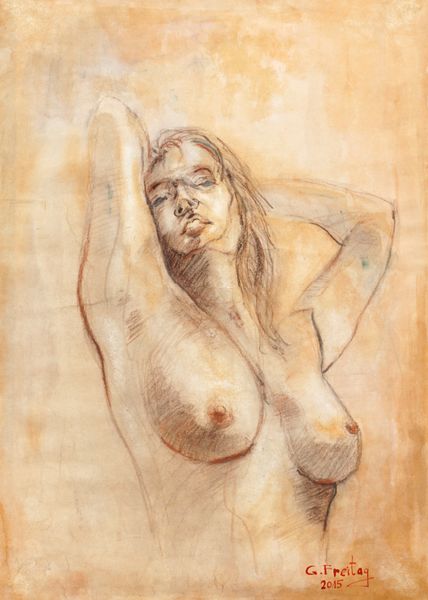 Curator: This is "Katie," an oil painting completed in 2007 by Gazmend Freitag. What strikes you immediately about it? Editor: The texture—I’m immediately drawn to how thick the paint is. It almost looks like impasto in places, especially in the depiction of skin. I can almost feel the weight of the material. Curator: Exactly. And consider that against the socio-historical context of portraiture. The availability of oil paints, commercially produced, shaped who had access to creating art. Commissions were largely for the elite, whereas portraits of working class people often appeared flattened, generic. This almost attempts a counter-balance. Editor: That's an interesting point. The subject certainly projects a direct gaze. A counter to historical female nude depictions created almost exclusively by and for men? It almost has a confrontational edge... but what exactly is it trying to do? The roses and her pose create almost opposing moods. Curator: It's less a rejection of the male gaze than a demonstration of labour – of time, the physical act of layering oils. How the subject would be posed in real-time for hours perhaps? Look at how Freitag depicts her arm holding her own hair – what labour is visible within Katie, or from Katie in response? Editor: Yes! This feels relevant now. Where photographic nudes are largely seen through curated and commodified images that require little physical labor beyond snapping the picture, this portrait seems invested in revealing production. Even with digital reproduction and online platforms today, something remains… different. Curator: I think it asks what is lost when an artwork is not understood as a record of production? And maybe it can't quite escape some art historical themes along the way. Editor: It’s given me a new way to see and interrogate realism. The conversation is always ongoing! Curator: Agreed, especially as our access to the art-making processes continues to evolve and change.