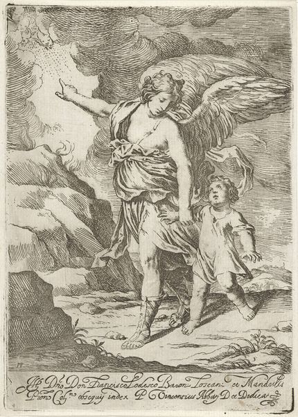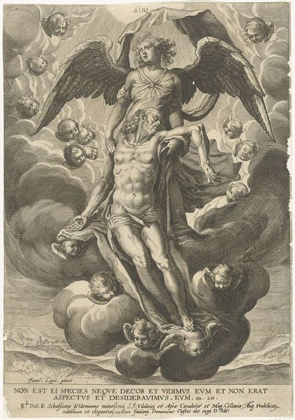 Editor: Here we have “Saint Michael Expelling Rebellious Angels from Heaven,” an engraving made between 1590 and 1610 by Joan Berwinckel. It has such a dramatic feel, with all that chiaroscuro lighting and swirling chaos. What are your initial thoughts when you look at it? Curator: The print is fascinating when considering the politics of imagery in its period. The drama, as you noticed, isn't merely aesthetic. Think of the Reformation – visual culture became a battleground. How do you imagine the public would react to the symbolism within this piece, the explicit visual message of good overcoming evil represented in Michael triumphing? Editor: I guess the symbolism of divine authority restoring order would resonate with people, especially given religious tensions back then? Is there a connection to events of that time that might shed light on its significance? Curator: Absolutely. Consider the Counter-Reformation’s use of art. The Church used these kinds of dramatic visual narratives to reassert its authority, to visually reinforce Catholic doctrine during a time of intense questioning. What do you notice about the composition and the gestures of the figures? How do they serve that purpose? Editor: Well, Michael has that strong, confident pose, crushing the defeated angel… almost looks like he's about to deliver the final blow. And the heavenly light shines exclusively on him. It is all very staged. So it aims to remind everyone of the Church’s ultimate power and righteousness, is what you are suggesting. Curator: Precisely. And consider the medium. Printmaking allowed for wider dissemination of this message, embedding this imagery deeply into the cultural consciousness of the time. What is fascinating for me is how effectively the visual narrative operates to convey that kind of ideology. Editor: I never thought about it quite that way, framing art as a visual argument within a historical power struggle. Thank you! Curator: Indeed. Analyzing art through a historical lens reveals a much more profound and nuanced understanding of not just the artwork but also the social and cultural values that it reflects and reinforces.