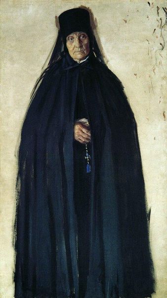 Curator: Standing before us is "Portrait of a Chinese Monk" by Alexandre Jacovleff. An oil painting, it embodies the artist's style of capturing ethnographic likenesses through a realistic lens. Editor: It’s the pervasive, almost monolithic blue of his robe that initially grabs my attention. Its matte texture seems to absorb rather than reflect light. There's a sense of gravity—literal and figurative. Curator: Absolutely. The robe functions as more than fabric; it signifies his detachment from worldly concerns, his adherence to a life of discipline and reflection. The deep blue is frequently seen in depictions of serenity, which perfectly suits a monk. Editor: And how the color interacts with the earth-toned backdrop intensifies the subject. The brushstrokes appear subdued, almost minimal. It's as though Jacovleff is prioritizing capturing the essence over superfluous details. Curator: Agreed. What interests me particularly is his direct gaze, seemingly unflinching and quietly observant. His posture conveys composure but also an understated receptiveness, reflecting ideals of contemplative Asian philosophy. Editor: The portrait achieves a delicate balance, then, between objectivism and interpretation. Despite being a clear representation, its emotional atmosphere leaves us pondering what might reside within his subject. Curator: Ultimately, Jacovleff has achieved something lasting in this rendering of a monk’s external presence interwoven with hints toward his inner spiritual world. Editor: And through the manipulation of hue, texture, and balance, the artist invites us to look and see beyond the immediate representation, allowing contemplation beyond observation.