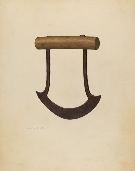 Curator: This is Elizabeth Johnson’s "Branding Iron," created around 1942 using watercolor and drawing techniques. What are your first thoughts about it? Editor: Well, it’s immediately stark, isn’t it? Almost melancholic. The rust colors, the way the tools are isolated... it whispers tales of open ranges and maybe something a bit tougher too. A lot of space and silence in the way it is composed on the canvas, almost echoing in the emptiness. Curator: Indeed. Note the composition; the branding iron is carefully positioned, almost floating, above what appears to be a detached segment or the branded symbol itself. This separation, enhanced by the negative space, emphasizes not just the tool’s function but its… latent power, perhaps? A study in instrumental purpose and semiotic distillation, rendered with careful realism. Editor: Power, absolutely. It also feels like loss to me. The tool, disembodied, separate from the act. The brand incomplete. Does that evoke, in your mind, not so much latent power, as the cessation of it? Johnson isn't showing us cattle being branded, right? Curator: Precisely. By decontextualizing it, Johnson encourages us to focus on its essential form—the handle, the head, the brand—allowing us to see beyond its immediate utility and consider broader themes of ownership, identity, even the imposition of control. The muted watercolor palette subtly underscores this… introspection. Editor: It almost renders the iron helpless; once it was powerful, imposing a hot claim. Here, isolated on the white void, it looks aged, used, put away. What kind of statement do you feel she is making about this object and what it used to stand for? Curator: Precisely! By removing the subject of the mark, the livestock, Johnson is perhaps suggesting that these acts of possession—these impositions of order and authority—are in themselves detached from genuine meaning when divested of human or animal engagement. It is indeed a silent, unsettling meditation on the act and impact of dominion. Editor: Well, I was thinking that Johnson, by portraying this mundane but loaded object in this style, reminds us of the multiple ways we relate to history. Not with grand tales but through quiet observation, recognizing both beauty and brutality woven into ordinary things. It is fascinating. Curator: Indeed, the layers of meaning unfold with sustained attention, leaving one with an intensified understanding of how functional objects participate in cultural and artistic representation.