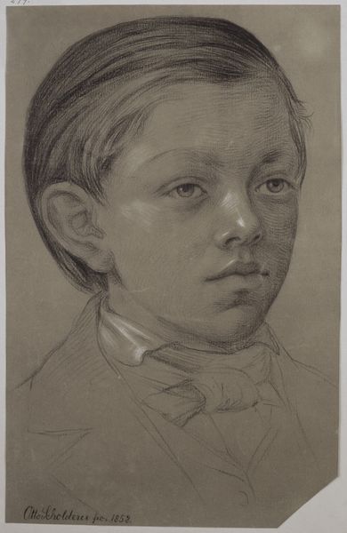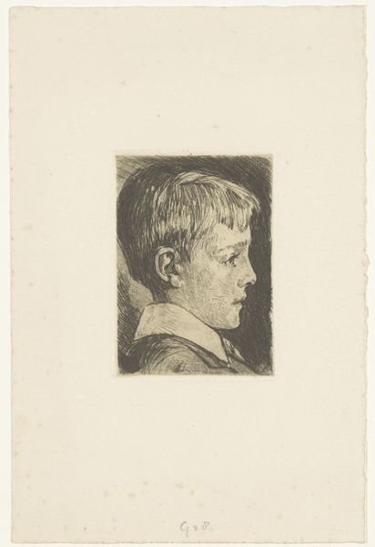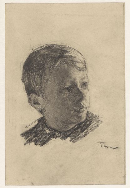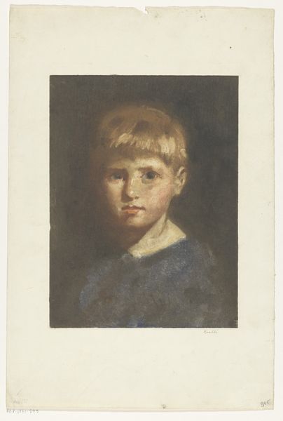 Curator: Willem Witsen, a Dutch artist from the late 19th and early 20th centuries, created this drawing titled "Jongenskop", sometime between 1870 and 1923. The piece combines pencil and watercolor on paper, and you can find it here at the Rijksmuseum. Editor: The first thing that strikes me is how muted and serious the portrait is, particularly with the blue watercolor wash in the background contrasting with the warm fleshy tones of the child’s face. Curator: Interesting observation! Considering the artistic climate of the period, it would have been crucial to choose these materials specifically; watercolor provides an excellent medium for portraying softer effects such as light falling on the child's face, while pencil defines the underlying structure and bones. The social class represented also seems relevant, especially for art buyers from the period. Editor: Yes, his downwards gaze makes him seem lost in thought. Blue often symbolizes melancholy; in portraits of young children, it might represent the burdens of youth. Considering it as an image within a cultural dialogue about innocence and the realities of childhood, his solemn look tells a larger symbolic story. Curator: Your insight into symbolism adds depth to our understanding. The choice to use accessible materials like pencil and watercolor is itself significant, perhaps challenging more traditional, labor-intensive oil portraits. These media offered flexibility, enabling artists like Witsen to experiment while possibly addressing issues of class, status, and the availability of leisure time. Editor: It makes me wonder what Witsen intended the work to communicate, not just about the individual boy, but about childhood itself. Perhaps he saw the loss of innocence within him? The artwork evokes a sense of fragility that echoes the temporary nature of youth, and watercolor further enhances this sense with its inherent transparency. Curator: Precisely! Analyzing it from a materialist perspective, one can see that this work, far from being a straightforward representation, serves as an engagement with the means of art-making, production, consumption, and how class is portrayed through accessible and economical artistic approaches. Editor: It seems we both find intriguing avenues into interpreting Witsen's "Jongenskop" - mine in the symbolic resonance, yours in material conditions and artistic agency.