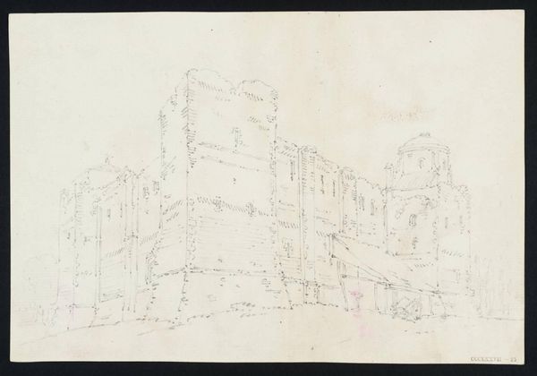 Editor: Here we have Cornelis Pronk’s "Kasteel Heeswijk," a drawing in ink on paper from the early 18th century, housed in the Rijksmuseum. It strikes me as very architectural, almost like a technical drawing. What do you see in this piece, looking at its composition and form? Curator: The precision of line is immediately apparent. Pronk delineates the architectural forms of the castle with remarkable clarity. Consider how the artist uses line weight, a consistent thinness, to create a sense of depth. It flattens the image, focusing our attention on the geometry of the buildings rather than atmospheric perspective. What effect does that have on your experience? Editor: It makes the structure the main focus, but it also feels a bit detached. Almost like looking at a blueprint rather than a realistic representation. It is interesting, though, how the emptiness around it enhances this quality. Curator: Precisely. The negative space is crucial. It isolates the structure, allowing us to analyze its components. Note the contrasting shapes - the angular rooftops versus the rounded turret. This interplay is what generates visual interest, a subtle tension within a seemingly objective rendering. Is there an underlying principle the artist may want to address with this juxtaposition of elements? Editor: Now that you mention it, maybe the artist wants us to consider the contrast between order and flow, like the castle against its more nature-infused surroundings. Curator: An insightful point. Through Pronk's calculated approach to line and form, a new depth is suggested, hinting that even an accurate rendering of place and form also represents its intangible counterpart, namely place. Editor: I see. It's fascinating how analyzing the simple lines and shapes reveals such a nuanced relationship. Thank you! Curator: Indeed. Studying art through form allows one to unveil deeper nuances.