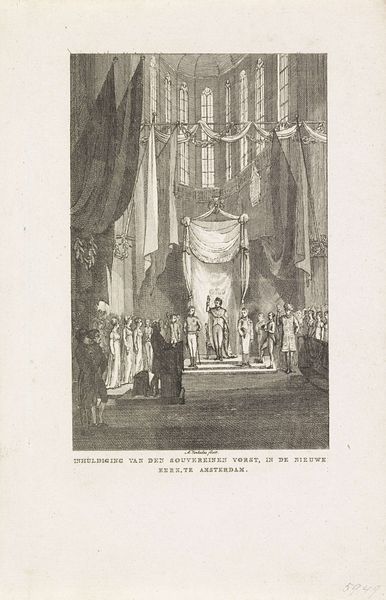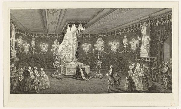 Curator: At first glance, the mood is so heavy and somber. The elaborate drapery almost suffocates the scene. Editor: This is Charles-Nicolas Cochin le jeune's print depicting the State Funeral of Maria Theresa of Spain at Notre Dame in 1746. Notice the plate's dimensions; it's considerably sized at roughly 20 by 13 inches. Curator: The sheer volume of people! I wonder what the symbolic weight of all those figures gathered represents for France at that time? Editor: It’s compelling to consider the labor involved in creating and staging such an event. Each detail in the cathedral, the fabric, even the vestments, represents a material process. Curator: Indeed. Visually, the artist uses this intense architectural space to amplify the symbolic impact of the monarchy and the church. Editor: The print itself, as a reproducible object, democratized access to the visual spectacle of power. Curator: It seems to present a very calculated image of grief and ceremony. Editor: Yes, and examining the materials used to create this image highlights that tension between spectacle and the everyday realities of production in 18th-century France. Curator: It's fascinating how it encapsulates both the grandeur and the weight of dynastic succession. Editor: A somber reflection on loss and the machinations of power, rendered through skilled artistry and material means.