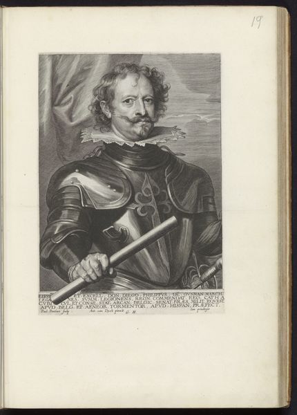 Curator: Immediately, I’m struck by the textures meticulously rendered here. Look at how Paulus Pontius captured the reflective qualities of the metal armor in this print of Lelio Blancaccio. Editor: It certainly evokes a stoic and somewhat severe mood, doesn’t it? The rigid posture, the unflinching gaze... But let's not get lost in surface appearances. It is important to unpack what this portrait communicates about power and societal hierarchies during the Baroque period. Curator: Absolutely, but the materiality shapes that communication. The sharp lines etched into the copper plate, the careful layering of ink – these choices speak to the labor involved in creating and disseminating this image of status. Notice the printmaking technique and how it democratized image production. Editor: That’s a valid point. The engraving’s accessibility allowed for a wider audience to consume and interpret this imagery of authority. But consider Blancaccio himself: what does his portrait, complete with armor and a sword, tell us about the militarization of identity? About nobility? About masculinity at this specific time? Curator: He’s presenting a carefully constructed image of military might and noble standing. Think about the physical act of wearing such elaborate armor. Its creation—the labor, the materials, the skilled craftsmanship involved—would've been immensely valuable and speaks of exclusivity. This isn’t just personal armor; it’s wearable wealth. Editor: Precisely! The weight of that armor also symbolizes the burden of leadership, perhaps even the weight of colonialism and its impact on various cultures. We can examine this artwork, housed here at the Rijksmuseum, not only for what it depicts, but also for the narrative it unintentionally unveils about domination. Curator: Ultimately, this print by Pontius is not simply a representation; it’s a record of labor, status, and societal values embedded in the very material from which it was produced. Editor: Right, a tangible reminder of the systems of power, both historical and those that echo into the present. Looking closer at these pieces encourages a much needed continuous critical conversation.