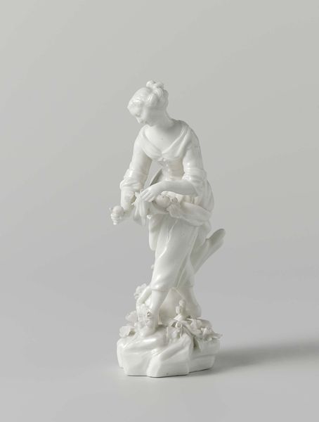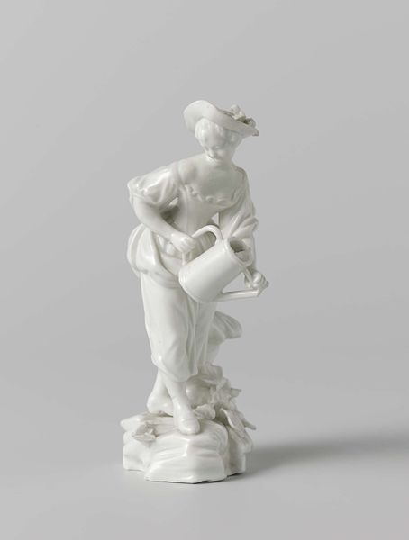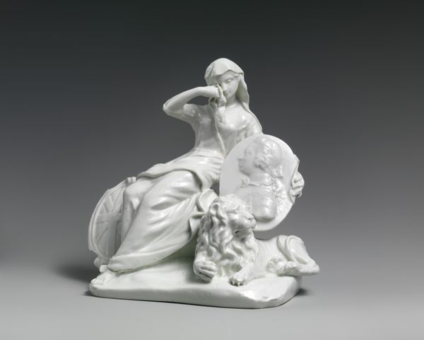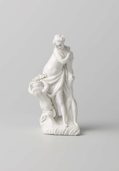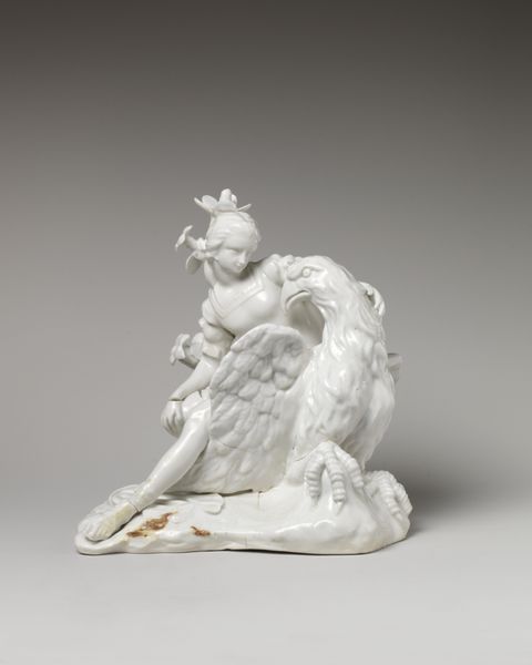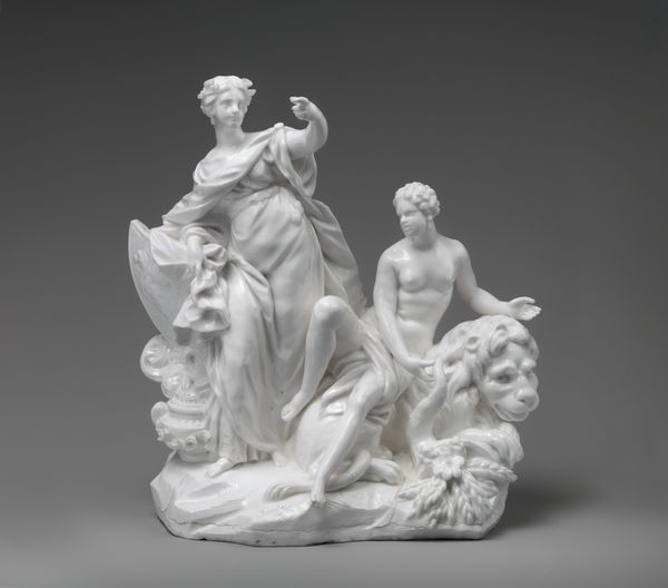 Editor: Here we have the porcelain sculpture, "Europe and America," made by the Vincennes Manufactory between 1747 and 1757. I'm immediately struck by its pure whiteness and the dynamic pose of the figures. What do you see in this piece, especially considering its historical context? Curator: It’s a striking example of how European manufactories used art to project power and influence. These allegorical figures embody continents, subtly asserting European dominance through the very act of representing “Europe” and “America.” Consider, too, that porcelain itself was a highly sought-after material, almost like a form of currency during this period. Editor: So, owning porcelain sculptures like this was a status symbol in itself, regardless of the subject matter? Curator: Precisely. And the allegorical content elevated it further. Ask yourself, who were the patrons commissioning such works, and what messages were they trying to communicate through them? This wasn't merely decorative; it was a statement about the global order, about centers of power. Editor: The figures certainly look confident. It’s interesting how an object as seemingly simple as a porcelain sculpture can hold so much cultural and political weight. Curator: These works are products of very specific cultural and economic pressures, shaping how global power dynamics were visualized and, indeed, validated through art. Understanding that dynamic helps us interpret the piece's meaning within its original context, and how it might have reinforced certain beliefs or assumptions. Editor: I see it now! It is really about how artistic representation participates in the creation of historical narratives, which may conceal just as much as they reveal. Curator: Exactly. Thinking about who funded this sculpture and for what purpose has helped us look more closely!