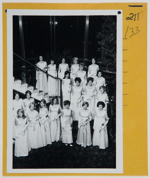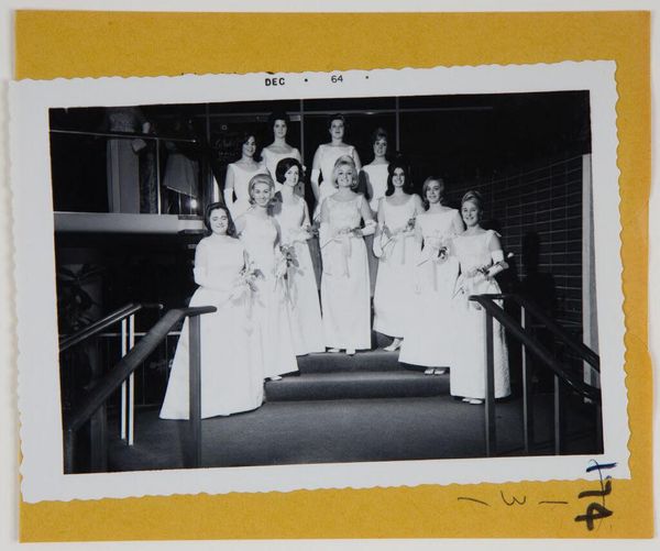 This photograph, Untitled (debutantes), was taken in December of 1964 by Robert Burian. The photograph presents a formal composition, defined by contrasting tones of black and white. The subjects, a group of young women dressed in debutante gowns, are posed on a staircase. The lighting emphasizes the texture of their dresses, while the black and white palette lends a timeless quality to the image. It’s a study in contrasts, where light plays against shadow, and texture creates depth. The way the light catches on the fabric of their dresses is especially interesting. The slight overexposure creates a dreamlike quality to the image, hinting at the constructed nature of the debutante tradition. Photographs like this remind me of the work of artists like Cindy Sherman, who also explored constructed identities in her work. It's a reminder that art is always in conversation with itself, building on past ideas and pushing boundaries. The photograph invites us to reflect on the multiple layers of meaning embedded within its frame, revealing the complexities of beauty, tradition, and representation.