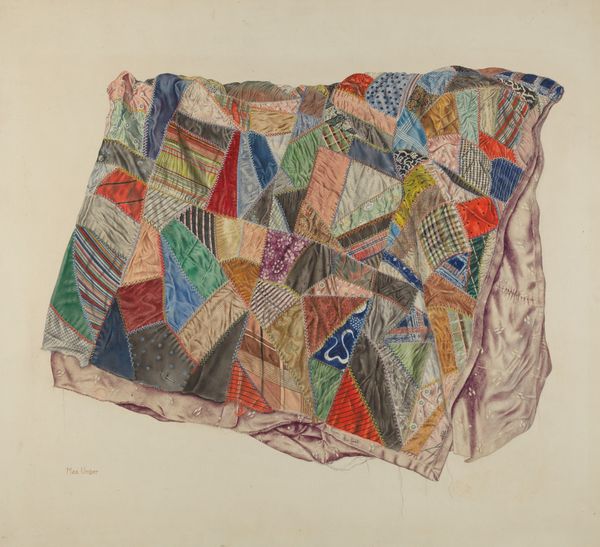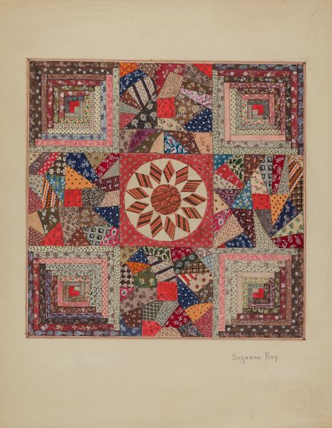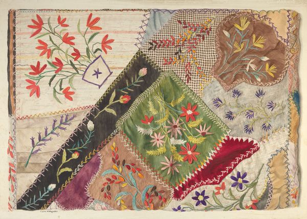 Editor: This is a mixed media piece, specifically a section of a Crazy Quilt, made around 1939 by Mina Greene. The variety of textile scraps, stitched together with such care, give it a strangely intimate and almost biographical feel. What catches your eye when you look at this work? Curator: It's a whispering cacophony, isn't it? All those colors and textures jammed together, yet held in balance by the stitching...like a family photo album where each face has a story to desperately tell. I see history, of course. Pieces of lives lived—fabric scraps whispering of old dresses, curtains, maybe even mementos from a loved one now gone. It's folk art, certainly, but elevated beyond mere utility into something intensely personal. Look closely, what do you make of the repeating motifs and images embedded in some patches? Editor: Now that you point it out, I notice the various flowers and that repeated crest-like image... perhaps they represent aspects of the maker's identity or interests? And there are some very surreal textile integrations as well. How much does the "crazy" of the Crazy Quilt embrace artistic liberties? Curator: Precisely. It's as if Greene is deliberately throwing open the doors of her subconscious. The "crazy" part becomes a canvas for memories, desires, and perhaps even fears. She's playing with controlled chaos, a beautifully organized mess. These elements are the heartbeats and rhythm within a pattern, don't you think? The rhythm and the composition gives each element space and context. Editor: I see it now, the "crazy" becomes almost meditative, telling a story without words. Curator: Exactly! A conversation through color, texture, and memory. Makes you wonder what stories future generations will piece together from our discarded scraps, doesn't it?