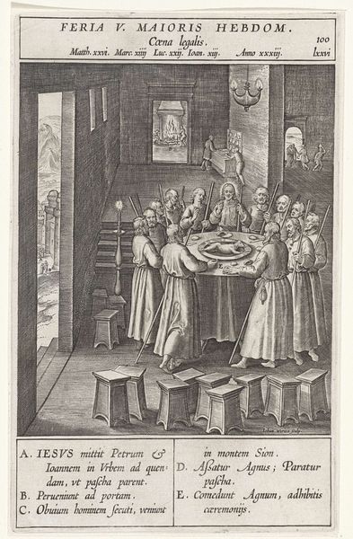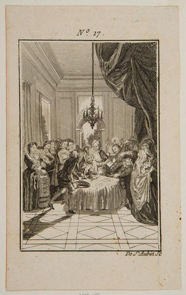 This engraving, "Women Visiting After Childbirth," was created by Jan Caspar Philips. The intricate details of the scene draw us into a domestic interior filled with social exchange. The composition is structured around a central table, around which women gather in various states of engagement. Philips uses the strict lines of the architecture and furniture—notice the towering cabinet and gridded windows—to frame the softness of the figures, creating a tension between the order of the domestic space and the lively interaction of the women. The text inscribed at the bottom, divides social classes, positioning the women within a specific cultural context. Philips asks us to consider the semiotic interplay between image and text. The precise engraving technique enhances the sense of detail. It invites a decoding of social structures and class distinctions in 18th-century domestic life. The artwork encourages us to reconsider the relationship between material culture, social behavior, and artistic representation.