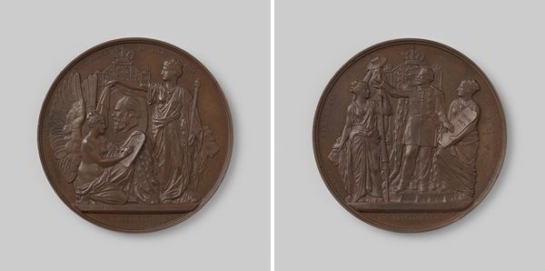 This bronze Masonic School Medal was created by William Mossop. Notice how the composition is dominated by the figures of a woman and several children, all rendered in high relief. These figures are positioned against a background featuring symbolic objects - a cross and an anchor. These design elements are not merely decorative; they are signs that invite interpretation. The cross, a symbol of faith, intersects with the anchor, representing hope, creating a visual dialogue about the virtues that the Masonic School sought to instill. The woman, likely an allegorical figure representing charity or motherhood, supports the children, reinforcing these themes. The textures achieved in the bronze, from the smoothness of the skin to the drapery folds, suggest both a classical and an idealized sensibility. The medal functions as a cultural artifact, embodying the values of its time and prompting us to consider how institutions use symbols to communicate their missions and ideologies.