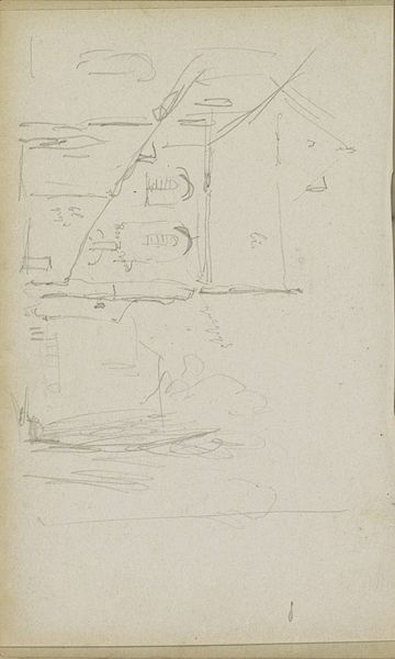 Curator: Here we have a cityscape sketch attributed to George Hendrik Breitner, tentatively titled "Stadsgezicht, mogelijk Amsterdam," dating from around 1889 to 1904. It’s a pencil drawing on paper currently held in the Rijksmuseum collection. Editor: Amsterdam, huh? It has that wistful, blurry quality like remembering a place half-dreamt. The muted tones almost drain the vibrancy out, like a half-erased memory. Curator: The apparent simplicity of Breitner's method – light pencil strokes on toned paper – belies a carefully constructed image. It seems as though this page was lifted directly from the artist's personal sketchbook, maybe capturing an initial idea. The visible structures are typical of Amsterdam's canalside architecture of the time. Editor: You can see it's just a starting point though. He’s captured just enough to evoke the sense of tall buildings and perhaps the rigging of ships… but he’s left it open. It's this "incomplete" nature of this that's appealing, like glimpsing something unfinished. I mean, there is definitely space for the soul to wander. It has such an intriguing openness. Curator: Yes, and consider the function of sketches during this period. They served less as finished artworks themselves and more as reference materials to capture a moment, or explore light effects and atmospheric qualities on location for future studio paintings. This immediacy makes sketches extremely compelling for us as viewers. Editor: True. So the beauty comes from it’s spontaneous feel - his eye on paper, unfiltered. It makes me think about our fleeting experiences in cities; how we grab impressions on the go. Curator: Precisely. There's a certain humility too, a directness… no grand statement is attempted here, just pure observation. You feel a direct link to the artist at work, decades ago. It connects on a visceral, human level. Editor: Absolutely, the human element resonates through his quick strokes. I think Breitner’s captured something essentially intangible with such simple materials. It might be more honest than a photograph. Curator: An honest rendering, a captured impression... and a record, of course, a symbol of place and time, interpreted through the lens of Breitner's distinct visual style. Editor: Well, I for one am very glad he grabbed his pencil. It gives a wonderful opportunity to imagine what this fragment of Amsterdam used to be.