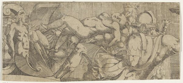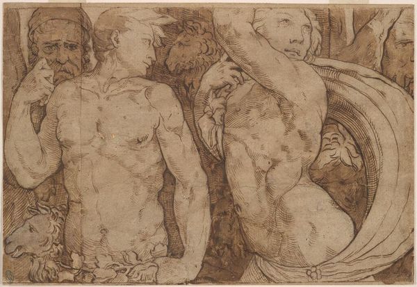 Editor: This drawing, titled "Doornenkroning van Christus," or "The Crowning with Thorns", created in the 17th century by Giacomo Cavedone, is rendered in pen, charcoal, and pencil. It depicts the Passion and, in terms of composition, there's a stark, brutal dynamism. What do you see when you look at this work? Curator: From a formalist perspective, what strikes me first is the tension created by the grid. Consider its superimposition onto the figures; the tension arises from the way the organic forms resist its rigid geometry. The contrast between the grid and figures enhances the emotional weight. Do you agree? Editor: Absolutely! It's like the grid is trying to contain the violence, but failing. It feels like the artist wants to convey some of the most gruesome aspects of religious persecution. How does Cavedone's use of light and shadow impact the narrative? Curator: Precisely. The artist has exploited the tonal range offered by charcoal to model the figures' musculature. The stark contrasts are critical for emphasizing the torment. Moreover, examine how line is deployed; see how nervous strokes contribute to the sense of urgency and unease, versus where lines are clean and definite? It yields an observation on who is more in control of the situation. Editor: That's fascinating! The different line work highlights their positions of power and helplessness. I hadn't considered that before. I was so caught up in the central figure that I failed to notice what surrounded him. Thanks to the different perspectives brought to bear, I'll have plenty to chew on. Curator: Indeed. Appreciating how an artist utilizes formal elements deepens our connection to and awareness of the work, shedding light on not only aesthetic qualities, but thematic concerns.