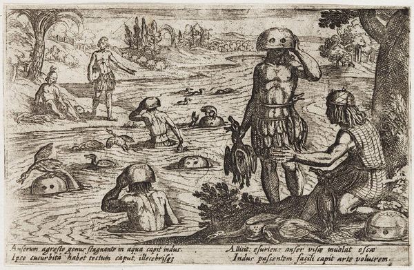 Editor: So, this is "Bird Hunt with Dogs" by the Workshop of Philips Galle. It looks like an engraving. What strikes me is the sense of action, the hunt unfolding across the field. What do you see in this piece? Curator: I see a landscape not merely depicted, but possessed. Consider the power dynamics: hunting, historically, was a privilege, a marker of social status. Who gets to exert dominion over nature, and by extension, over those who depend on it? Editor: So, it's not just a scene of hunting; it’s about power? Curator: Precisely. The hunt, throughout art history, has often been used to reinforce hierarchies and legitimize social control. The act of taking life becomes a symbol of authority. Editor: That reframes the entire image for me. I see the hunters less as sportsmen and more as symbols of a system. Curator: It's a chilling reminder that even seemingly benign scenes can be laden with complex social and political meanings.