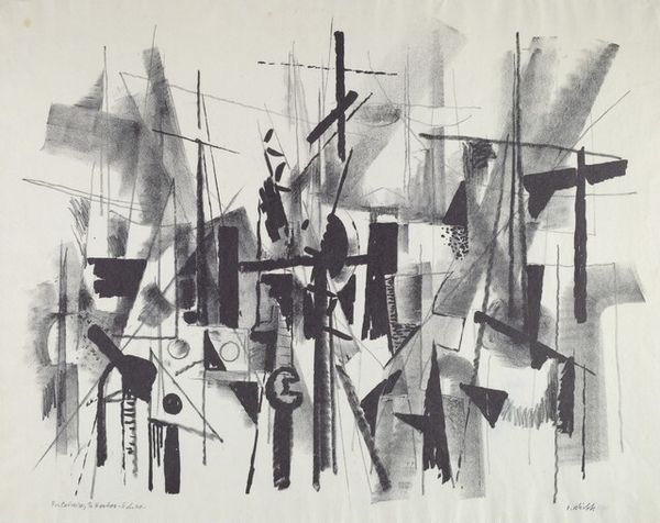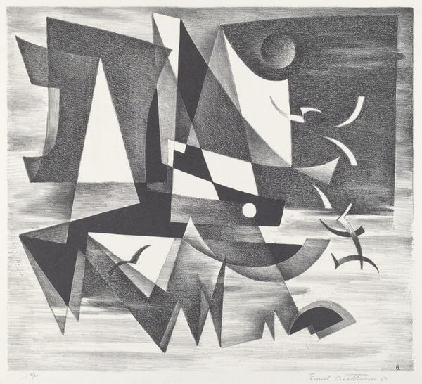 Thomas Harry Kapsalis made "Precarious Situation", a print, in 1949. It's a playground of shapes, almost like a visual alphabet where each form has a delicate balance of positive and negative space. The texture! It's not smooth, but it's got this great, almost scratchy feel. Look closely, and you can see how the ink sits on the paper, giving each shape its own distinct character. The white shapes push forward, creating a layered, almost floating sensation against the dark background. Take, for example, that star-like shape. It's not perfect, it's edges are uneven, almost as if it's been carved out of wood. It reminds me a little of Miro, or maybe even some of Gorky's more playful forms, but there's a rawness here, a sense of experimentation that feels very personal. It's not about perfection, it's about the act of making and seeing what happens. It's a conversation between the artist and the material, and we're invited to eavesdrop.