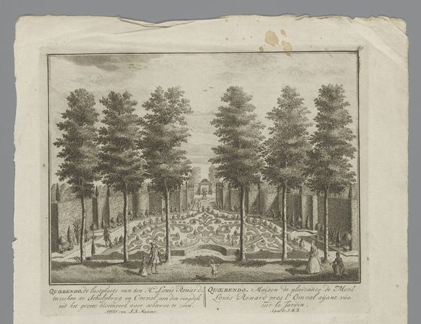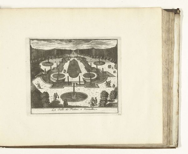 Editor: We’re looking at “Gezicht op de cascades van een tuin van de koning van Denemarken te Kopenhagen,” an 18th-century watercolor painting. It gives a bird’s-eye view of this elaborate garden, with precisely arranged trees and cascades. What strikes me is the rigid formality. It almost feels like a stage set rather than a real space. What's your read on this, Curator? Curator: You know, stage set is an interesting way to put it. I see this as an artist grappling with the very concept of perspective. The miniature figures seem almost overwhelmed by the geometric garden. To me, there's a playful tension between the real and the artificial, amplified by the slight distortions. The cascades, like theatrical backdrops, cascade through the garden! I think they bring a feeling of structured fantasy. How does that hit you? Editor: I like the phrase 'structured fantasy.’ It does feel like something constructed, layer by layer, rather than observed. There's a controlled exuberance that almost cancels itself out. Do you see any irony in portraying such a lavish display in watercolor, which is considered to be delicate and unassuming? Curator: Absolutely, I'm always a fan of artwork offering an absurd, delicious paradox. Imagine, creating such extravagance with what’s considered, well, modest! Also, I wonder how the social climate influenced art at this time. Does knowing the era enrich the feeling or shift it in your mind at all? Editor: Definitely. Knowing it's the 18th century, I see echoes of the Baroque era – this idea of grand, ordered beauty meant to impress. But the flatness and miniature scale adds this layer of detached observation, that’s very special. Thanks for pointing that out, it changes things for me. Curator: You got it! For me, these visual windows into history keep me thinking that the story of us isn't done. It can grow new wings.
