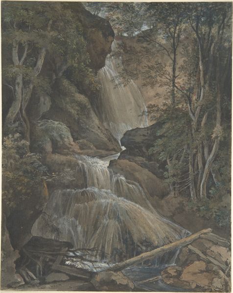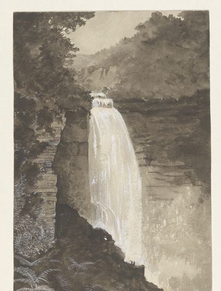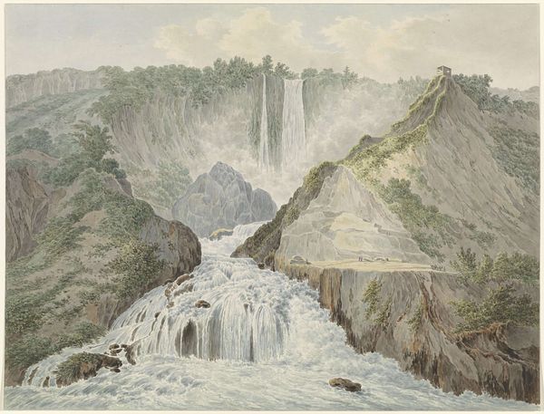 Curator: Seth Eastman’s watercolor, "The Laughing Waters Three Miles Below the Falls of St. Anthony," painted between 1849 and 1855, captures a fleeting moment of life near a powerful waterfall. It's a really interesting mix of observation and perhaps… a touch of something else. Editor: My first impression is… well, idyllic, almost deceptively so. The light, airy washes of color and the little vignettes – a hunter, a leaping deer – they soften what I imagine must have been a pretty overwhelming landscape. Curator: I think you hit on something there. Eastman, who was also a military officer, had unique access and a mandate to document Indigenous life. What we see, I believe, is nature perceived through that specific historical lens. Editor: Yes, the strategic act of framing nature itself. The waterfall becomes a romantic backdrop for the figure of the Native American hunter – his presence staged within a larger narrative of the "untamed" wilderness, as if placed there for a painting, forever pursuing. Curator: Absolutely, and consider the scale. That single figure drawing his bow at the cliff’s edge becomes the fulcrum point of wilderness versus civilization, rendered by very deliberate brushstrokes. Look at the loose flow in rendering that vigorous falls and compare with that solitary archer and bounding deer. It’s a story of conquest, maybe a subtle form of visual rhetoric of Manifest Destiny? Editor: The tension is in the romanticization of nature and also the potential for conflict embedded in that very staging. While Eastman seeks to portray harmony, there is that inevitable tension you identified arising from what we know to be the fate of America’s Indigenous population. That sense of impending sorrow tinges the bright beauty for me. Curator: Eastman's artistic project raises an interesting historical consideration on artistic production of his time. He, along with many artists like him, shaped not just representations but also, through their renderings, justified expansionist ideas and social dynamics, even without intending such an agenda. His choice of medium here creates an incredible intimacy while rendering a distant time and place. Editor: Right, “The Laughing Waters”… A name promising joy and lightness. But what kind of laughter is it, really? Is it the gleeful gurgle of undisturbed nature or something far more ambivalent – a last chuckle on the edge of transformation? Something to ponder on… Curator: Indeed. An artwork full of depth both intended and captured for the moment.