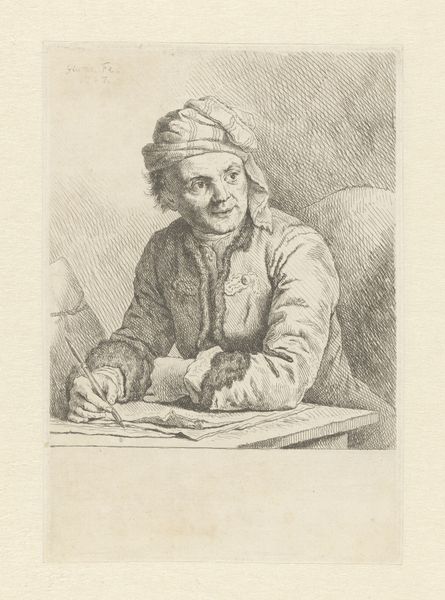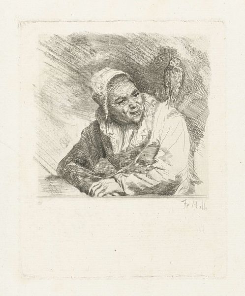 Editor: Here we have Louis Bernard Coclers's etching, Malle Babbe, created sometime between 1756 and 1817. There's a striking quality to the woman's face, a sort of jovial knowingness, contrasted by the owl perched on her shoulder. How do you interpret the symbolic relationship between the woman and the owl? Curator: Well, owls traditionally symbolize wisdom, but also darkness or folly, depending on the cultural lens. Here, I'm particularly drawn to how the artist positions the owl. Is it a familiar, a partner, or a commentary on the woman's perceived nature? Owls have strong symbolic links to the Greek goddess Athena, to wisdom and strategic battle. Are we meant to consider Babbe’s hidden attributes, beyond an initial glance? Editor: That's interesting. I initially read the owl as a symbol of oddity, maybe even isolation. But considering its association with wisdom, I wonder if Coclers is suggesting that Babbe possesses some unique insight or knowledge. Curator: Exactly. And what about the woman herself? What details stand out? Look at her laugh lines, her relaxed posture. She isn’t ashamed or hiding, instead meeting the world with what seems to be confident amusement. Coclers is possibly playing with contrasting cultural symbols to convey her emotional or intellectual states. Are there any archetypes coming to mind? Editor: Now I’m thinking about the wise woman archetype. There’s an element of societal disregard toward those deemed "other," and yet wisdom and experience can often reside in unexpected places. Thanks. Now I have a lot to think about! Curator: The cultural memory embedded in symbols often offers unexpected layers of understanding, right? Keep asking these incisive questions, and you will be going far.