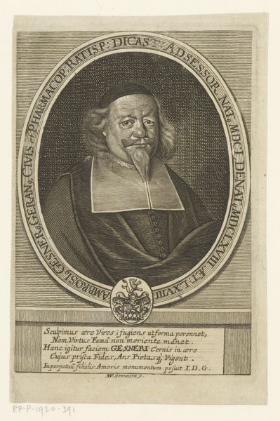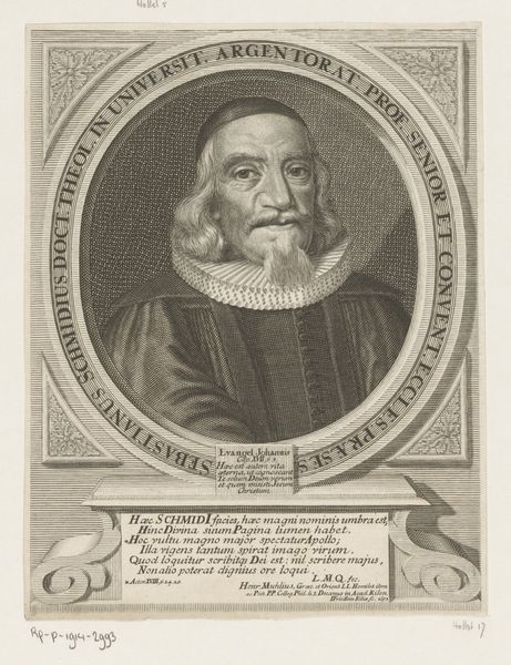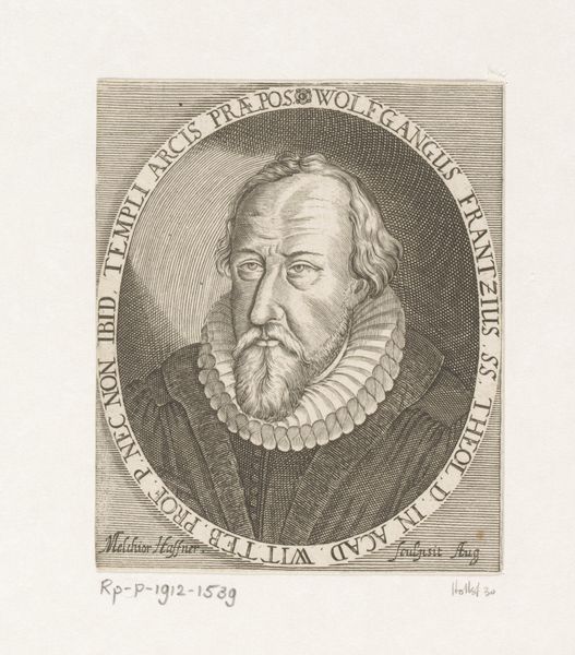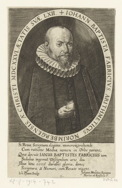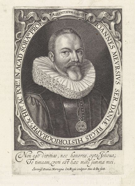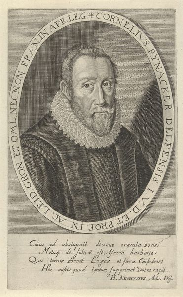 Editor: This is “Portret van Philipp Nicolai,” an engraving made around 1605 by Heinrich Ulrich. The sitter’s stern expression and the sheer volume of text surrounding him definitely set a serious, almost scholarly tone. What do you make of this image? Curator: It feels like peering into a time capsule, doesn't it? This portrait whispers stories of a world wrestling with faith and knowledge. I’m struck by the contrast of textures Ulrich achieves through engraving, the rough fur juxtaposed with Nicolai's lace collar and smooth skin. The oval frame, heavy with inscription, nearly suffocates him. I imagine the artist felt constrained by expectations for accurate depiction and conveying the sitter's status. Do you see hints of humanity peeking through? Editor: Definitely in the eyes, which seem softer and perhaps a little melancholic compared to the firm set of his mouth. Also the fact that he's holding a book; that small detail is interesting. It is symbolic, of course, but hints to me at what truly defines him. Curator: Indeed! That book is like a key unlocking a deeper understanding. Perhaps Ulrich, even within the confines of portraiture, wanted to convey the subject's inner life. Considering the Northern Renaissance and emerging Baroque influences at play, this artwork stands at a fascinating crossroads. What does this piece whisper to you about portraiture's role then versus now? Editor: I suppose back then, there was an agenda to immortalize the person in ways that elevate and honor, to ensure their legacy, but nowadays we expect portraits to show reality even if that's imperfection, even with flaws. Curator: You nailed it. I keep getting drawn to the almost photorealistic quality mixed with blatant symbolism, all framed with what feels like a verse torn from an old psalm. Editor: I’m so glad we took a moment to reflect. I never thought a simple portrait could be this interesting. Curator: Me neither!
