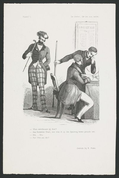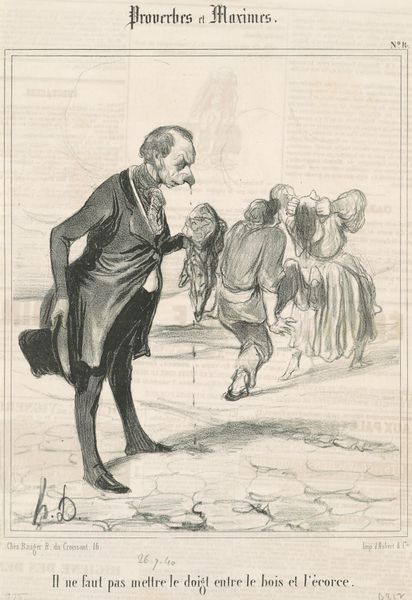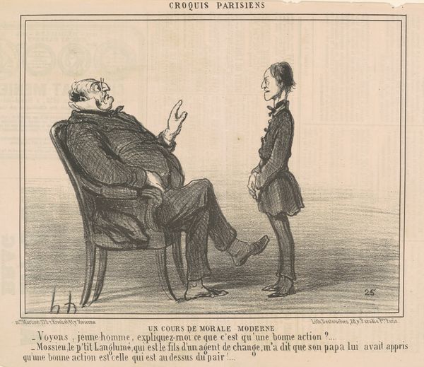 Editor: This is "Macaire Héritier-Philanthrope," a lithograph print by Honoré Daumier from around the 19th century. The image, to me, reads as pretty satirical. What do you make of it? Curator: Satirical indeed! Look at the exaggeration of the figures – the lounging man's bulging belly, the other's almost painfully thin frame. Daumier uses caricature brilliantly here. It's funny, but it's also pointed. What do you think Daumier is commenting on with these extreme physical forms? Editor: I'm guessing it's poking fun at the wealthy. The relaxed man looks like he's enjoying a life of leisure. Is Daumier maybe questioning their generosity or philanthropy? Curator: Precisely. "Philanthrope" is in the title, after all! Daumier was known for his social commentary. He captured the follies and hypocrisy of the bourgeoisie. I always feel there's a deeper understanding in his humour though, a subtle wink, as if he understands their absurdity while simultaneously feeling a bit of empathy for them. Can you sense any of that feeling, do you think? Editor: Maybe a little. It's in the eyes, right? They seem...not entirely unkind, even in caricature. I learned a lot! I'll never look at a Daumier print the same way again. Curator: Good. Perhaps, instead, you'll look *more closely.*