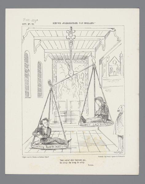 Editor: Here we have a lithograph, pen and ink drawing titled "Spotprent over de Tentoonstelling van Voorwerpen voor de Huishouding en het Bedrijf van den Handwerksman, 1869," or roughly, "Cartoon about the Exhibition of Objects for the Household and the Business of the Craftsman, 1869" by Johan Michaël Schmidt Crans. It’s a busy image; there are three figures in the foreground standing in front of what looks to be a building under construction. I’m curious, what catches your eye in this piece? Curator: Immediately, I see a fascinating layering of symbolic spaces. The grand exhibition hall looming behind is itself a symbol of progress and industry. The unfinished wooden wall becomes a barrier, both physical and metaphorical. It seems to say something about access and exclusion from the promise of that progress. The common man feels excluded. Editor: Interesting, I didn’t pick up on that exclusion initially. Can you elaborate? Curator: Notice how the figures are drawn – they're smaller, their expressions more downcast compared to the grandeur of the building. The text below reveals they feel unrepresented in the fair. Also note the dominance of the architectural elements, the rigid lines and defined spaces. They are set against the relative smallness and vulnerability of the human figures. How does this tension speak to you? Editor: Now I see that too, especially with the building dwarfing the figures. It’s as though they’re present, but not truly part of the celebration. The symbolism of a literally incomplete society is fascinating! Curator: Precisely. By the use of visual imagery and context, we see how societal progress isn't necessarily distributed equally, creating emotional resonance through time. It invites viewers to ponder what remains unfinished, and whose voices are unheard. Editor: That’s really given me a new perspective on how seemingly simple imagery can contain deeper social commentaries! Curator: Indeed. It showcases how artistic pieces of this era serve as time capsules, reflecting both the aspirations and anxieties of their age.