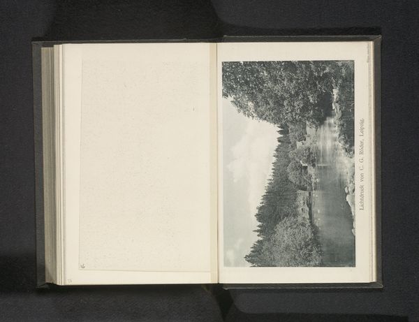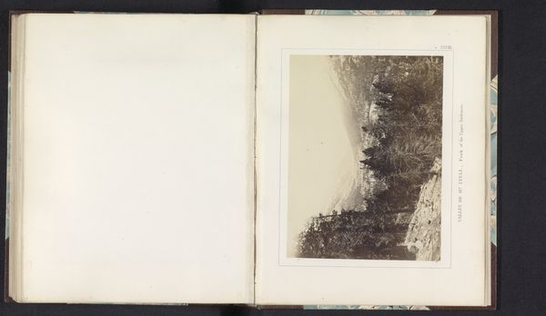 Curator: Here we have "Berglandschap nabij Suldalsosen," a landscape etching, graphite and photograph print, believed to be created before 1893, by Paul Lange. The piece showcases a dramatic mountain landscape near Suldalsosen. What strikes you first about it? Editor: Well, it's overwhelmingly moody. All those grey tones... It feels like a landscape shrouded in a heavy silence. It is so contained by this pristine white space in this album that amplifies the almost claustrophobic scene—dense trees, imposing mountain face, a river cutting through... There’s a beautiful tension there. Curator: I think the photographic elements contribute to that mood. Lange was working in a period when photography was changing landscape representation—it was able to give realistic but not objective representations of the scenery, this might offer a more grounded perspective on nature as this was an era defined by burgeoning industrialization. Editor: I see what you mean. But to me, this isn't about objectivity at all. Look at the way the light filters through the trees, almost dreamlike, the softness of the etched lines softening that "realism." The human impact is subtle, almost hidden within nature's majesty. A lone bridge that hints to life. Curator: And that's interesting, given Lange's context. Landscape art was often tied to national identity and pride, this piece may embody a reverence for Norway's untouched natural beauty. But with the hint to photography it does feel somewhat divorced from that artistic trajectory as it creates almost a visual report about the location instead. Editor: Absolutely. The etching process itself is about building depth and atmosphere. I'm fascinated by that combination of precision and artistic interpretation—this feels both intimate and grand. Curator: It also prompts us to consider who had access to these images back then. Prints made art and these scenic places more accessible beyond the wealthy elite which in turns reinforces the cultural importance to this land to its people. Editor: Indeed. The beauty, even in monochrome, captivates. Makes one wonder about Lange's intentions – a landscape of national pride or an inward escape. Curator: A complex landscape representing complicated issues I suspect. One where history and emotional experience flow together much like the waters shown in the print. Editor: A very astute reading, thank you!