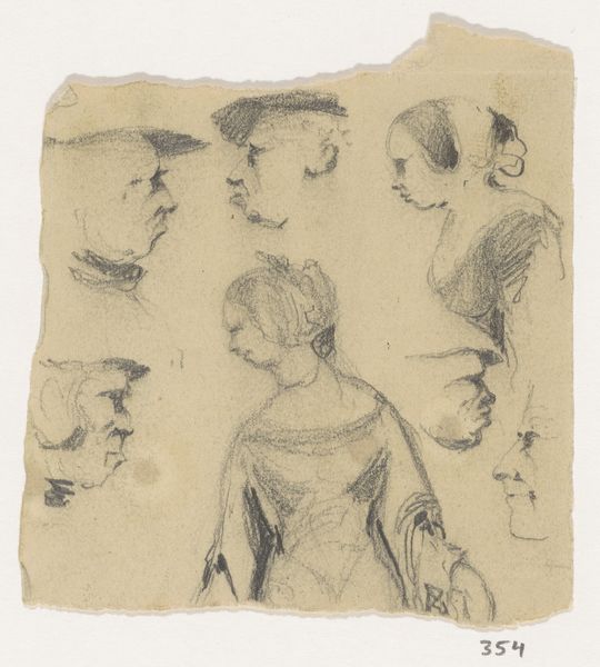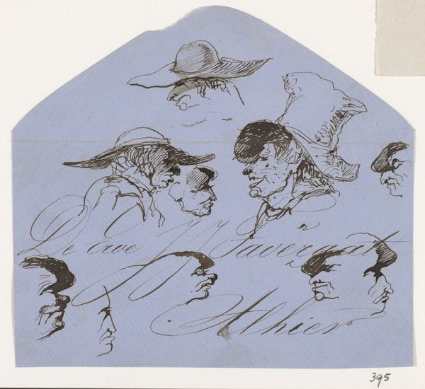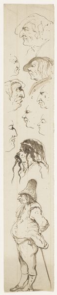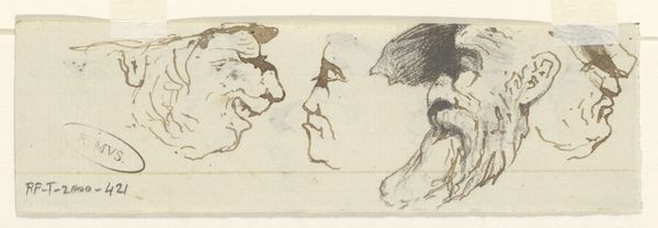 Editor: This is “Koppen,” dating somewhere between 1840 and 1880, by Johannes Tavenraat, held here at the Rijksmuseum. It’s a collection of heads, or rather, profiles, sketched in ink. I'm struck by how the artist plays with caricature, almost exaggerating features. What do you see in this piece, particularly within its historical context? Curator: I see a window into 19th-century social observation. The exaggerated features aren't just playful; they’re potentially loaded with societal biases and power dynamics. Caricature, then as now, could be used to satirize, to demean, or to reinforce existing stereotypes about class, ethnicity, or even gender. Do you see how certain faces are rendered with more pronounced features than others? What might that signify? Editor: I hadn't really thought of it that way, but now that you mention it, there are definitely some faces that look more…severe than others. So, you're suggesting that these aren’t just random sketches, but possibly social commentary disguised as playful drawings? Curator: Exactly. These "types" often reflected and reinforced the prevailing social order. How might we interpret this today, given our heightened awareness of representation and social justice? Editor: I guess, viewed through that lens, the artwork becomes a bit uncomfortable. It’s not just a quaint sketchbook page; it's a record of how people were categorized and potentially judged in the 19th century. Curator: Precisely! Art often unwittingly reveals the biases of its time, prompting us to confront those historical realities and reflect on our own contemporary perspectives. It reveals the evolution of society itself. Editor: Wow, I’ll definitely never look at sketchbook art the same way. Thanks! Curator: My pleasure, this is what I hoped would be achieved, a new understanding!