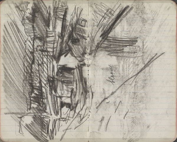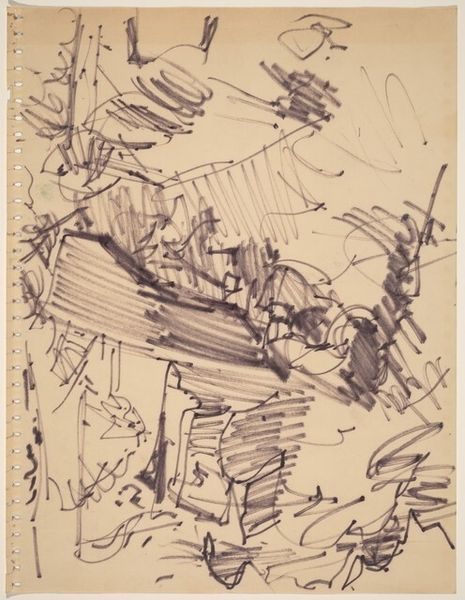 Editor: This "Untitled" drawing by George Bunker is crafted with ink and pen on paper, showcasing an abstract landscape. There's something immediate about the marks; they feel impulsive. What do you see in this piece, beyond the obvious landscape elements? Curator: Impulsive is a great word for it! For me, this piece vibrates with a raw energy, doesn't it? I think it’s the artist wrestling with form. Look at the density of lines in certain areas. Do they suggest shadow, or perhaps a tangled undergrowth, or is it merely the pure, unadulterated joy of mark-making taking over? It feels like Bunker is pushing the boundaries of representation. What do you make of the white space? Editor: It feels deliberate. Like breathing room within the chaos. Without it, I think the drawing would feel claustrophobic. So, you're saying the drawing isn't just about what *is* there, but also what's *not* there? Curator: Exactly! The negative space allows the eye to rest, to discern shapes and textures from what initially appears to be a jumble. It makes you participate more actively in the creation of the landscape. Makes you wonder, perhaps, what Bunker was seeing, or feeling, at that precise moment. It’s almost as if you're glimpsing into the artist's mind. I wonder what sort of landscape inspired this rapid, visceral reaction, and what it meant to him. Editor: That's fascinating. I never thought of negative space as an active element. Curator: It’s all about the push and pull, isn't it? The artist guides us, but it’s up to us to complete the journey. And, in that collaborative spirit, what does this "landscape of the mind," as I might cheekily call it, leave *you* with? Editor: I am taking away the energy of the hand creating the image and how the eye interacts with it! Thank you!