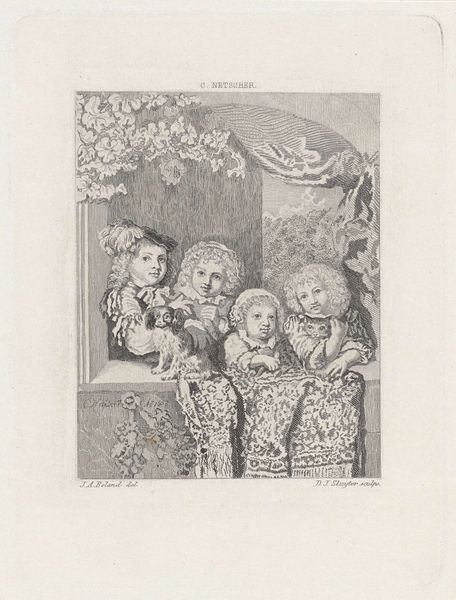 "Two Children in a Window" is an undated piece by Abraham Pieter Felix. It is rendered in shades of gray and is contained within a structured, rectangular format. The symmetry established by the window's arch and the figures positioned within create a balanced, almost classical composition. The artist employs chiaroscuro to direct the eye, using light and shadow to emphasize the children's faces and the intricate details of their clothing and surroundings. The structural elements of the window frame and the sharp contrast of light against dark give a sense of depth and enclosure. The image explores themes of domesticity and innocence, yet the formal arrangement also suggests an awareness of the artwork's structure as a constructed image. Felix does more than depict; he arranges forms and values to engage with conventions of representation, inviting a discourse on the nature of viewing itself.