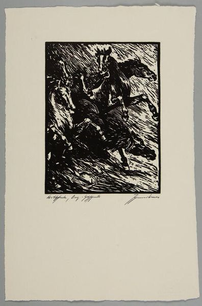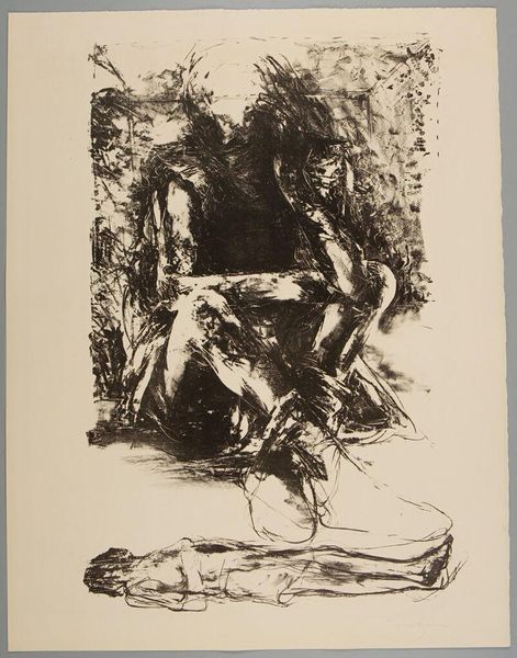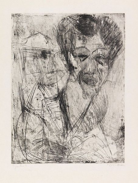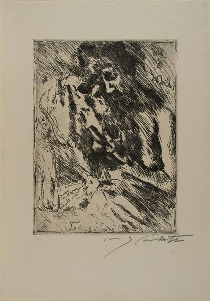 Curator: Lovis Corinth, an artist active in Germany during the late 19th and early 20th centuries, created this etching entitled "Death and the Couple" as part of his "Dance of Death" portfolio. Editor: It’s incredibly unsettling, isn't it? The scratchy lines and stark contrast give it a raw, almost frantic energy. You can feel the weight of mortality. Curator: Corinth made this portfolio relatively late in his career, in response to the First World War. It speaks to a broader artistic trend of grappling with the ubiquity of death in modern society. Editor: Absolutely. It's like he's exposing the vulnerability inherent in intimacy, in coupledom, framing it against the backdrop of mass death and societal upheaval. It is a critique of power structures, particularly how war disproportionately affects marginalized communities. Curator: I agree. The artwork underscores how major historical events have an impact on the individual and how it reflects a time of immense social change. Editor: Precisely. Seeing it within that context, it reminds us that personal narratives are always interwoven with broader socio-political forces.