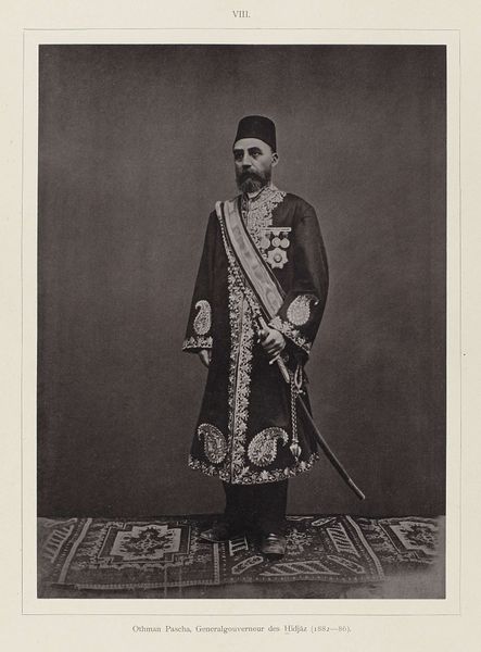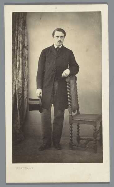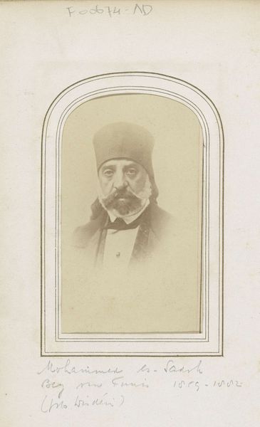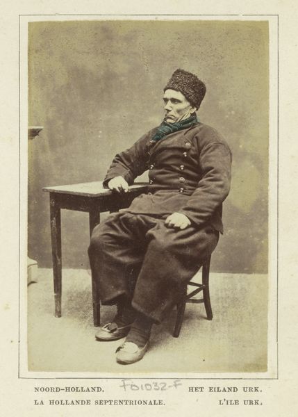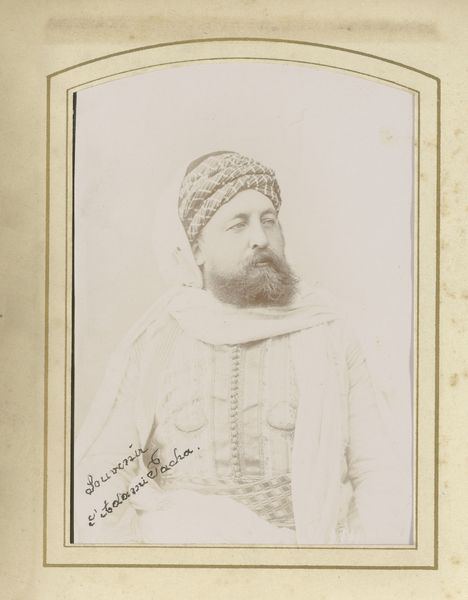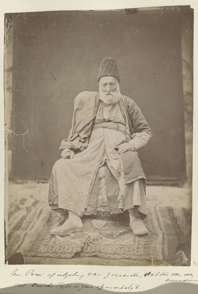 This is a portrait of a man, by Antoine Sevruguin, made with photography in Iran. The sepia tones and soft focus lend the image a sense of timelessness, almost as if it exists outside the flow of historical time. The subject is centered, creating a balanced composition that draws your eye directly to his face. His gaze, direct and unwavering, establishes an immediate connection. The textured hat, contrasted against the plain background, introduces a play of tactile versus smooth, highlighting material qualities within the photographic print. The carefully arranged elements—the hat, the clothes, the letter—act as signifiers. They invite us to decode their cultural meanings and consider the layers of identity and representation at play. Sevruguin's artistic choice invites us to consider how the photograph, as a medium, shapes our perception of reality and identity.