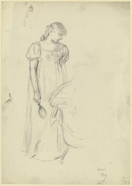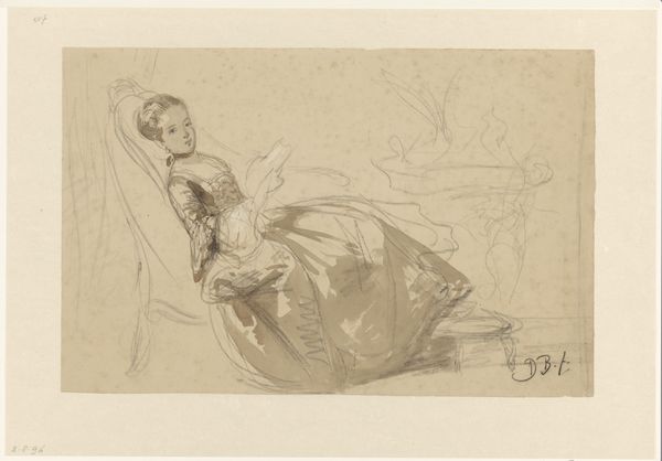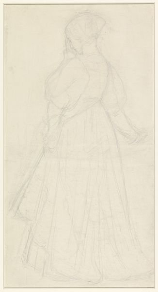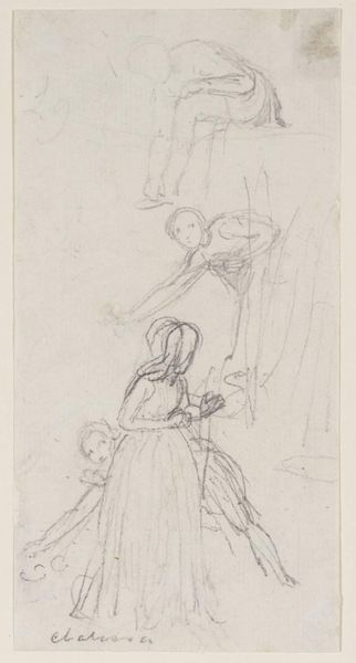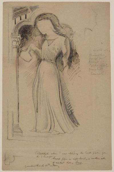 Editor: So, this is "Design for a Gothic Arch with the Artist and Effie Ruskin Embracing," a pencil sketch from 1853 by John Everett Millais, housed at the Art Institute of Chicago. It looks like a tender, perhaps even a slightly burdened interaction between the artist and Effie. How would you interpret this piece? Curator: The Gothic arch, a symbol in itself, frames their relationship. The architectural detail is fascinating—not just structure, but also memory and aspiration. Note how Millais depicts himself close to Effie, yet their touch is hesitant, almost a seeking of absolution. Considering Victorian ideals, does this embrace speak of societal expectation, or a deeper yearning? Editor: Absolution… That’s interesting. It seems like there’s another sketch on the back as well. Is it related? Curator: Absolutely! The verso depicts Effie as an angel, which significantly elevates the symbolism. The arch becomes a celestial gateway. How does it change your perception when seeing her now as a heavenly figure? Editor: It’s like he’s projecting an idealized image onto her, perhaps wrestling with the earthly versus the divine within their relationship. Curator: Precisely! What feelings does that idealized angelic figure evoke when seen through a modern lens? Are we witnessing admiration, idealization, or something perhaps more complicated given their history? Editor: It feels…complex. There’s a tension between reality and aspiration. This piece has revealed layers about societal norms and personal struggles intertwined through visual metaphor. Curator: Indeed. Images provide echoes that vibrate differently depending on who's perceiving them. The work resonates because its iconography, though historically bound, taps into enduring human desires and the inherent gap between reality and how we envision things.