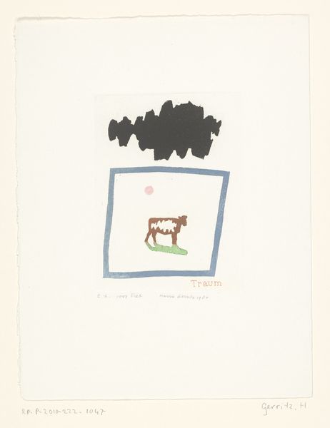 Curator: Here we have "Oiseaux" from 1980, a screenprint by Harrie A. Gerritz, now residing here at the Rijksmuseum. Editor: Well, my first impression is tranquility. It's so minimal, a sliver of sky and earth encased in these calming blues and greens. There's something almost meditative about it. Curator: Absolutely. Gerritz was deeply invested in the craft of printmaking, particularly screen printing. Note how he uses those flat blocks of color, layering them with precision to build up the image. It's an abstraction, yes, but still very grounded in the physical process of its creation. Editor: It does make me wonder, what paper did Gerritz chose and how did he find this shade of green? It's that pale gradient. And what's your reading of these simple forms? The little bird shapes feel more like emblems, telegraphing some larger narrative or some hidden symbol. Curator: Yes, those "oiseaux", those birds, seem to hover, almost uncertain. He was working during a time of increasing industrialization, when artists were turning toward natural imagery as refuge. Here, he seems to be capturing a longing for something simpler, an echo of nature lost to the noise of modern life. He plays with how this landscape fits together to show how our current reality might need that longing to give itself hope. Editor: Interesting point. When you think of abstraction, so much about it has turned to being "above" reality and not actually reflecting upon materiality or daily life itself. And that, again, begs questions about production. How do Gerritz's methods connect to what's available within screen printing that isn't there with something more gestural like painting, and how would that affect our interpretation of what "hope" or nature can be when represented in flat space? Curator: Perhaps Gerritz uses the medium to communicate nature itself with "less" reality? The artwork becomes this distillation of natural forms. The rigid boundaries, in their mechanical reproducibility, challenge the "free" natural state, too. Editor: So we go from the concrete to the…philosophical! From labor, materiality, process, and the artist's intent, and it reveals its message in each shape and the production's nature. Curator: Indeed. A small, simple print, yet full of these deeper conversations about how we see, make, and ultimately value our world. Editor: The questions a piece like this provokes, both on process and reception, prove just how "finished" this piece really is!