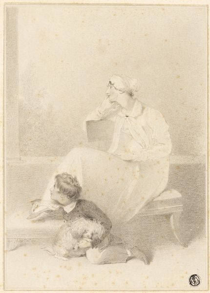 Curator: The artwork we’re observing is titled "Lili vil synge for en sou," which translates to "Lili will sing for a sou.” Created in 1861 by Lorenz Frølich, this piece is rendered in delicate pencil on paper. Editor: It's overwhelmingly delicate; the lines are so fine they seem almost ethereal. It evokes a quiet, contemplative mood—there's something almost sentimental about the scene. Curator: Indeed. Frølich, during the Danish Golden Age, often portrayed scenes of domestic life infused with narrative weight. In this, we see a young girl looking up to her mother as if negotiating the very concept of performance and compensation. What do you read from that? Editor: Structurally, there's a strong vertical emphasis; the bureau, the mother, the chair—all drawing the eye upward and contributing to that serene feeling. The paleness reinforces that delicacy, although it lacks robust form and instead blends to suggest something of ephemeral sentiment. Curator: Perhaps more than ephemeral, the narrative gestures toward economic realities embedded in childhood. Singing for money points toward a very specific kind of performativity, reflecting socio-economic dynamics within domestic spaces. It’s almost a visual ethnography. Editor: That verticality also directs our attention to Lili, whose form is subtly more distinct than the adult. There's a formal weight given to her by the contrast and texture—drawing a conceptual, aesthetic parallel that the work has been dedicated to her likeness in a world still marked by patriarchy. Curator: Yes, the gaze between mother and daughter encapsulates a whole spectrum of expectations and nascent awareness of social currency and even female expectations. There's an entire network of symbolic exchanges occurring here. Editor: For me, considering only the visual syntax, it's amazing how a piece rendered in such sparse materials can produce this full emotive narrative. Curator: A perfect example of how seemingly simple depictions of domesticity can offer deep insight into social dynamics through enduring images, yes? Editor: Agreed; now that you've pointed toward it, I understand there's considerable cultural value in a genre painting as ostensibly straightforward as this.
