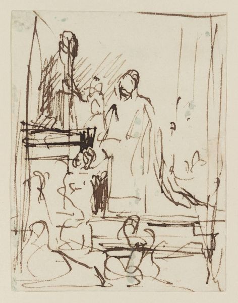 Curator: This quick sketch comes to us from the hand of William Henry Hunt, a British artist who lived from 1790 to 1864. The work, currently held at the Tate, depicts two figures, seemingly in charcoal, on a small scale. Editor: It’s striking how the artist conveys such a sense of intimacy despite the limited detail, especially in the figures’ faces. The dark charcoal creates a sort of protective enclosure around them. Curator: Precisely! Hunt was working during a period of significant social change in Britain, and images of domesticity and familial bonds became increasingly important as symbols of stability. Editor: I see the veiled figure in the back as an almost archetypal mother, a protective force, while the other figure embodies youthful innocence. The contrast is powerful. Curator: That reading certainly aligns with the period's emphasis on idealized representations of women and children. This sketch offers a glimpse into those cultural values. Editor: Indeed, it resonates with a timeless visual language. I'm left wondering about the untold stories within this simple yet evocative piece. Curator: It is certainly a reminder of how artistic intentions can echo through the ages.