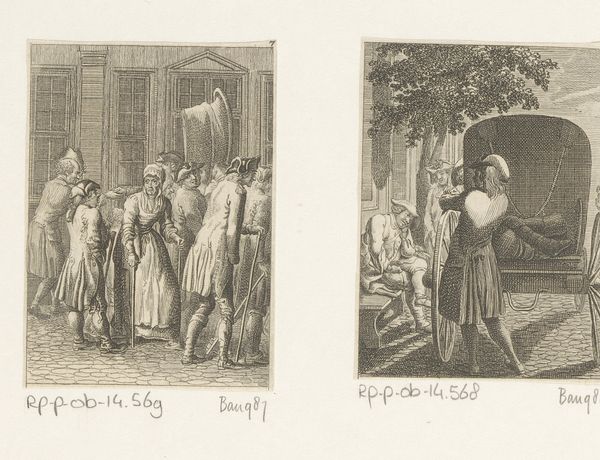 Curator: This engraving, "Yorick en de dame worden in hun gesprek onderbroken door een Fransman," created in 1783 by Daniel Nikolaus Chodowiecki, presents us with a fascinating glimpse into social dynamics. The Rijksmuseum houses this gem. What strikes you initially about it? Editor: There's a kind of awkwardness hanging in the air, wouldn't you agree? The composition feels almost theatrical, like a little stage is set, and everyone's playing a part, rather stiffly if I may add. Curator: Well, consider the etching process itself. Each line is carefully etched into a metal plate, a meticulous labor involving acid and precise tooling. The social context is the Age of Enlightenment, marked by both refined courtly love and burgeoning class awareness, impacting the distribution of printed media in society. Editor: Interesting! That explains, perhaps, the static nature I see. It almost feels as though time is frozen or interrupted like a hiccup. And that so-called interruption must mean a disturbance in the character's narratives, a comical one judging by that Frenchman's awkward gestures! Curator: The artist utilizes line work and cross-hatching to construct form, creating a visual language intended for wide circulation; thus this genre piece becomes an accessible and affordable artifact, reproducible through manual print. What does that tell us? Editor: It makes you think about its mass appeal and the possibility for parody. To me it reveals something far deeper than a simple encounter; there's an implication of social tension and class distinctions, filtered with some gentle mocking humor. The kind of 'gotcha' moment for those absorbed by grand love tales... Curator: Precisely. And if we zoom out to view the broader network, consider who had access to prints like these and what function those visuals fulfilled back then. Editor: Absolutely. To look beneath the scene—the texture, the density—brings something alive and I see more than mere images now; a piece of history caught in that frozen instant.