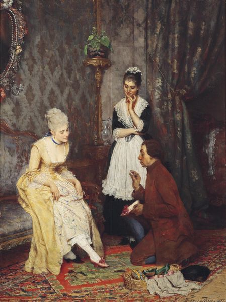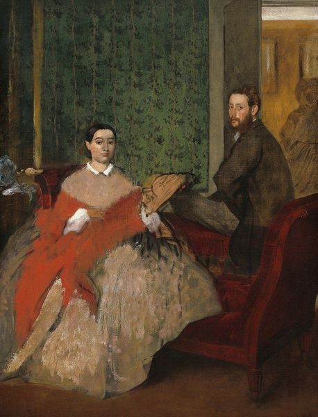 Curator: Let’s delve into Eva Gonzales’s "A Box at the Theatre des Italiens" from 1874. Editor: The immediate sense I get is one of subdued elegance, but there’s a certain starkness, almost an unfinished quality to some of the brushwork. The composition, especially the juxtaposition of the woman's pale skin against the dark backdrop, it’s quite striking. Curator: Absolutely. Gonzales was part of a world wrestling with identity and representation, and this artwork becomes a narrative point illustrating how women navigated social spaces and were also claiming artistic recognition. Consider what it meant for her as a woman to portray women observing in a space primarily designed for observation. Editor: Looking closely at the brushstrokes, particularly in rendering the woman's dress and the gentleman’s jacket, reveals a wonderful spontaneity. It is very painterly. It certainly aligns her with the Impressionistic pursuit of capturing the ephemeral, almost like the moment of an instant itself. Curator: But also consider what that moment encapsulates, especially for the woman depicted. Is she an active participant or an object on display herself? The gaze, the posture, all imply a complex dynamic within these social constructs. We also shouldn’t disregard her training under Manet, or her connection to the literary scene and figures like Zola. These points are not simply biography; they inform the artwork's intention. Editor: The starkness I noticed before... the formal tension contributes to this atmosphere. There are a few areas—look at the edges of the male figure or the detail on the opera glasses—where the clarity diminishes, which almost enhances the viewing point. Curator: Which prompts one to question: Whose perspective are we meant to adopt? This becomes critical when contextualized within the ongoing dialogues of gender, visibility, and artistic agency. Is it passive viewing or reflective commentary? Editor: A compelling thought indeed. I walk away noticing, mainly, Gonzales' orchestration of tones— how each muted hue informs the overall effect of sophistication touched by melancholic isolation. Curator: And hopefully, also, thinking more critically about women as both the subject and the artist of modern life.