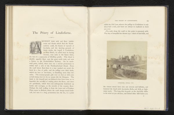 Editor: Here we have a print titled "Detail van Lindisfarne Castle," dating back to before 1864, by Stephen Thompson. It’s a gelatin silver print featuring a ruined archway within the book itself. It feels rather melancholic and reflective to me. How do you interpret this work? Curator: The archway certainly speaks of ruins, time, and memory. Consider its placement within the book, a container of knowledge. Does this suggest Lindisfarne's inclusion in the collective cultural memory? Does the image invoke the idea of knowledge being fragmentary or fading? What is communicated through this symbolic architecture? Editor: That's a compelling point. The image feels so self-contained. It also conveys a powerful sense of history through that symbolic arch. Curator: Indeed. And arches often symbolize transitions or portals. What psychological associations arise when seeing an arch in decay? Does the photograph’s stillness evoke an echo of what once was? A physical symbol standing in for past grandeur? Editor: Now that you mention it, the ruin implies not just history, but also loss or change. Is that what makes it so poignant? The weight of time represented in decaying stone? Curator: Precisely. It embodies a layered symbolism – the literal stones of a castle transformed into a powerful meditation on memory and the passage of time. What about the tonal qualities in the photograph. Do you think that conveys particular emotive attributes or meanings? Editor: The faded look lends it this beautiful timelessness... making the loss feel even more distant. Curator: And in doing so, also creates a shared past, one with which we can all potentially connect to in some fashion. This invites the observer into contemplating their own memories, perhaps, and what the relics and artifacts of the contemporary era will mean for the future.