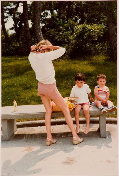 Curator: Elaine Mayes' photograph, "Quogue," presents a seemingly candid beach scene. There's a certain nostalgia evoked. Editor: The tonality is fascinating. Soft light gives the composition a faded, almost dreamlike quality. The contrast feels intentionally muted, almost like a memory. Curator: Indeed, the image captures a pivotal moment in American history, reflecting anxieties about nuclear proliferation, notice the "No Nukes" graffiti. Editor: Visually, the placement of the figures feels very deliberate, framing the "No Nukes" barrel in the background, enhancing the narrative tension. Curator: And that VW Beetle, a classic signifier of the era, is juxtaposed with the later model station wagon, hinting at changing times and societal concerns. Editor: The horizontal lines of the vehicles and the beach create a sense of stillness, while the diagonal line of the beach grass hints at movement, a visual balance that I find compelling. Curator: Ultimately, the photograph operates on multiple levels, conveying both personal experiences and broader socio-political commentary. Editor: It's a powerful image, rendered with a unique sensitivity to light, form, and the complex emotions of a time.