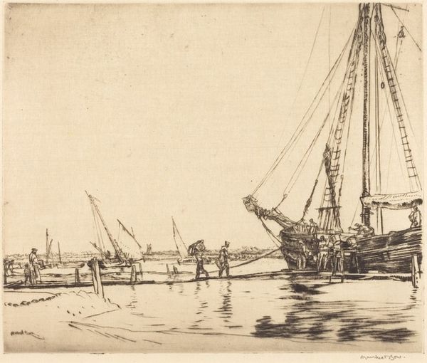 This delicate etching, "Vier mannen in sloep" was created by Willem Gruyter Jr. in the 19th century, using a copper plate. The lines you see were made through a labor-intensive process. The artist would have coated the plate with a waxy, acid-resistant ground, then scratched an image into it with a needle. Finally, the plate would be bathed in acid, which bites into the exposed metal, leaving behind incised lines. In this print, the fineness of the lines evokes a sense of detail and depth. Look closely at the textures of the water and the wooden boats; the linear marks create tone, volume and shadow, to describe the scene. Like other kinds of prints, etching was a democratic medium, capable of circulating images widely. In this case, the scene suggests the rise of leisure time during the industrial era. Consider the skilled labor and the social context embedded in the work. It challenges us to expand our understanding of art, by looking beyond traditional boundaries.