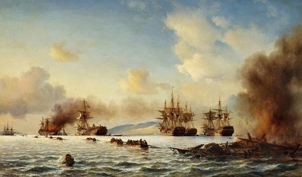 Alexey Bogolyubov painted this image of 'The Battle of Gangut' sometime in the 19th Century. Here, vessels clash amidst a hazy vista, yet the image speaks to more than just naval conflict; it echoes a deep, primal struggle. Notice the recurring motif of the vessel, both as a symbol of progress and conquest, which hearkens back to ancient times. The ship, a vessel of souls, mirrors traditions where boats carry the dead into the afterlife, connecting battle with the inescapable journey of life and death. Consider the smoke and the chaos as an expression of the psychological turmoil of war. Turner, too, explored similar themes of chaos and the sublime. The collective memory of naval battles is not merely about strategy or victory; it's about the profound, often subconscious, confrontation with mortality. It's a powerful force that engages viewers on a deep, subconscious level. The image continues to evolve, echoing in modern films and narratives, forever reminding us of the cyclical nature of conflict.