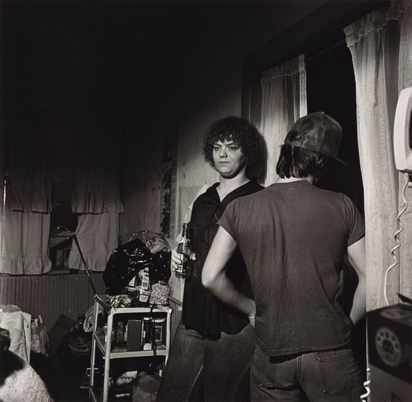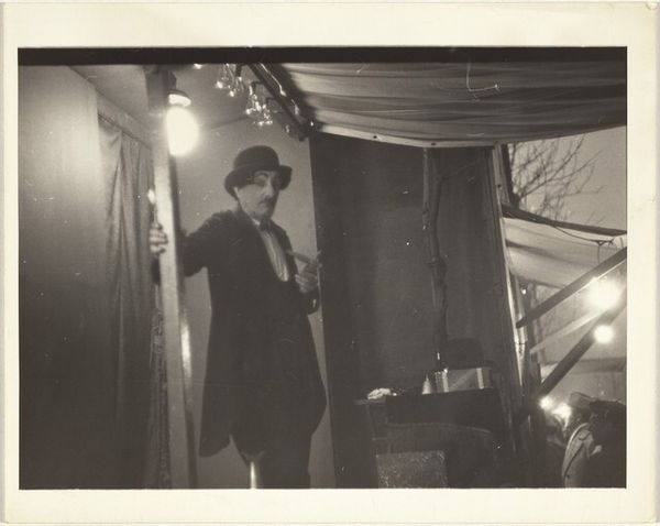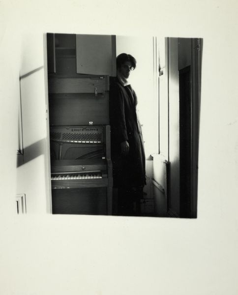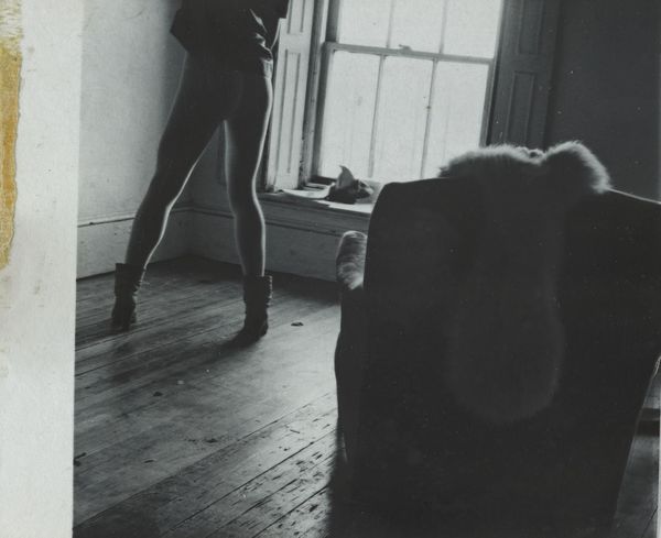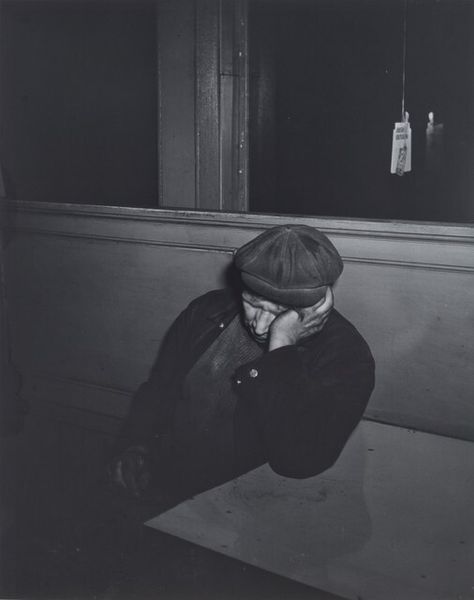 Editor: This is Robert Frank's "Old Woman/Barcelona," a gelatin silver print from 1952. It's strikingly dark, almost claustrophobic, and the woman’s gaze is so intense. What's your perspective on this work? Curator: I see a commentary on the material conditions of life in post-war Europe. Look at the composition: the woman is almost swallowed by darkness, but her eyes and the object in her hands are sharply focused. The object, likely holding wares for sale, hints at labor and a struggle for survival. Consider the materials, a mass-produced gelatin silver print—its accessibility contrasts with the woman’s possible poverty, highlighting societal inequalities. Editor: So, the choice of medium is deliberate? Curator: Absolutely. Frank is not just documenting poverty; he is implicated in it through the act of photographing and distributing this image. How is this labor of photographic production distinct from, or complicit with, that of the subject it depicts? The print, multiplied and circulated, enters a market economy, potentially objectifying the woman. Editor: That makes me think about how street photography always has a layer of exploitation by its very nature. How might this work speak to broader issues of labor beyond this individual? Curator: The harsh contrast and gritty texture emphasize the lack of polish, reflecting the realities faced by many. It serves as a social document of laboring class lives in a specific time and place, prompting questions about the ethical implications of documenting—and potentially profiting from—someone's hardship. It invites reflection on the value and distribution of labor within society. Editor: So, we're invited to consider not just the subject, but also the systems surrounding the photograph itself. Thanks, I hadn’t considered the material aspects in such detail. Curator: Exactly! And hopefully, by examining this artwork from this perspective, we might deepen our appreciation for Frank's message.