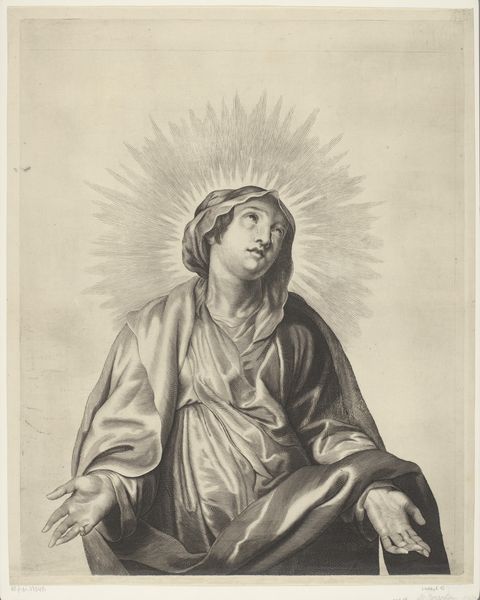 Editor: This engraving, "The Virgin looking up to the left, in bust length in an oval frame, after Reni," by Guillaume Vallet, was made sometime between 1645 and 1704. It feels very delicate, almost ethereal. I’m curious, what stands out to you in this work? Curator: As a materialist, I immediately consider the labor and production inherent in an engraving. Think about the skill required to create such fine lines and the tools necessary. The reproduction of Reni’s work raises interesting questions. Who was this print intended for, and what kind of access did it offer to an image of the Virgin otherwise reserved for a specific class? This work challenges boundaries between what we consider high art and what is simply reproducible and for consumption. Editor: That's interesting. I was just thinking about the image itself, her piety and expression. Curator: But shouldn't we also consider the materials, like the paper and ink, and the social context that made such reproduction desirable? Who profited from this work? Editor: So, you're less concerned with the artistic intent and more with the nuts and bolts of its creation and distribution? Curator: Not less concerned, but I think a materialist approach compels us to consider art not just as a product of individual genius but also a product of very specific social, economic and historical forces. It speaks volumes about consumption habits of the period. How easily would these have been sold and bought? Editor: I hadn’t really thought about it like that before, focusing more on the surface and its symbolic message. Now I am thinking about the markets and networks required for such detailed engravings. Curator: Precisely! Hopefully, thinking about art's physical construction broadens how we value it, and what we question when standing in front of the piece.