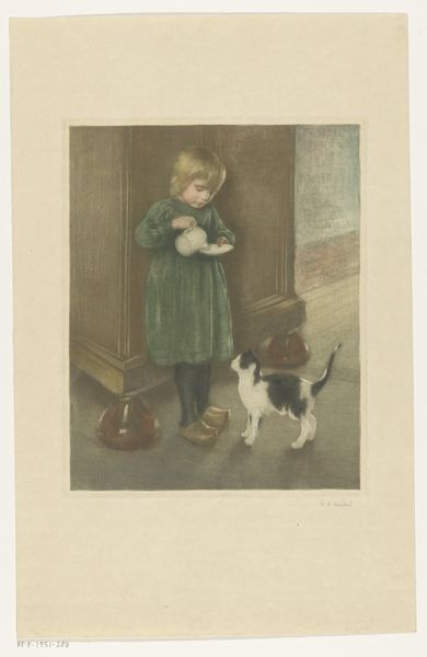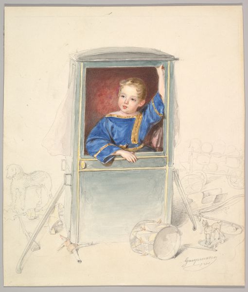 Curator: Skovgaard's watercolor and colored pencil work, "A Boy Sitting in a Cellar Doorway, Luring a Puppy," completed around 1844, strikes me immediately as tender, almost secretive. Editor: Absolutely, there's a definite mood of hushed intimacy. What fascinates me is how the texture of the brickwork contrasts with the softer treatment of the figures. You can almost feel the cool dampness of the cellar stones. Look at the deliberate way he uses the materials to create this sensation. Curator: The boy’s outstretched hand, the puppy tentatively approaching – these evoke classical symbols of invitation, the vulnerability of new beginnings. This also points toward broader concepts like connection. The setting becomes the visual vocabulary for intimacy. Editor: Precisely. The artist is showing us not just a sweet scene, but a world constructed from simple resources: pigment, paper, colored pencils. And note how the drawing, using modest means, levels any expectation for academic fine art. It emphasizes the universal appeal through direct engagement with accessible materials. The act of depiction is down-to-earth, connected to craft. Curator: Do you find something melancholic in the image? To me the darkness inside the cellar speaks of a space where imagination thrives, away from expectations. It feels like a visual metaphor for the Romantic spirit of the time. Editor: Perhaps, but I see something pragmatic here, too. The making of the artwork isn't trying to evoke drama but a slice of daily life. I think there's beauty in Skovgaard’s choice of depicting an everyday subject with the everyday materials. It says something profound about value of lived experience itself. Curator: That contrast, between everyday experience and romantic idealism, is where the power of the image lies, perhaps. I come back to how such a humble medium communicates to the universal search of innocent connection, childhood comfort, and new friendship, rendered so delicately and convincingly. Editor: It definitely transcends its materials and offers a compelling, relatable story. Considering Skovgaard used these commonplace means—watercolor and colored pencil—I find its impact surprisingly complex, showing us art's potential with minimal fuss.