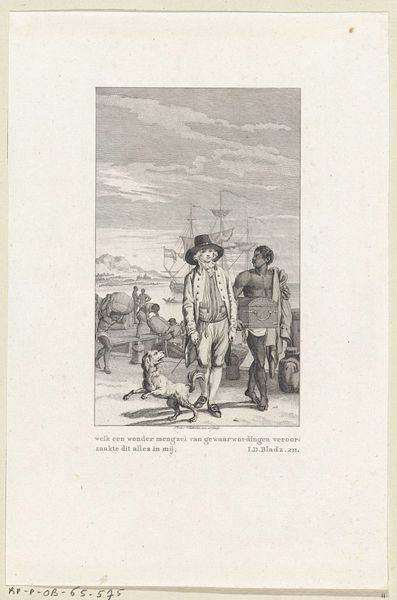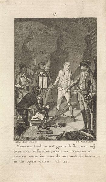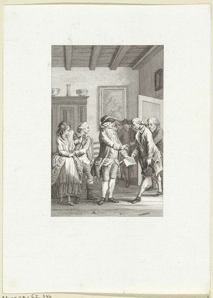Curator: Today, we’re observing an engraving from 1790 by Reinier Vinkeles entitled "Vrouw toont haar gebalde vuist aan een andere vrouw," currently housed in the Rijksmuseum. Editor: It's striking, this print—an immediacy, really. All this compressed anger and anxiety focused in that one fist! I am particularly drawn to the social dynamics implied within this composition and the narrative suggested in the interplay of glances and gestures among all the individuals pictured here. Curator: Absolutely, the dynamic tensions created via formal balance! Note how the woman's raised fist—almost centered in the image—draws the viewer’s eye upward toward the placard overhead with the words: DE MINYVRIGE. Editor: Ah, that’s interesting because knowing that, “The Petticoat Government,” now the labor, I mean spinning labor displayed on the one side and domestic control suggested on the other seems very…loaded, I mean culturally constructed as evidence here. I find this fascinating how engraving itself acts as both document and critique—what would we learn by studying how Vinkeles himself organized his workshop? Curator: The use of line is masterful in creating a sense of depth, particularly within the architecture; see how the light filtering from the window falls to emphasize that depth. Note, too, how the stark contrast between the shadowed interior space and brightly lit figures heightens drama, compelling our attention. The lines work as signs, representing gender, class, and narrative, wouldn't you agree? Editor: Yes, and I’d argue the contrast pushes beyond mere formal drama; the means of print production—engraving specifically—lends the scene social context. This was reproducible for wide distribution at a certain price point—I want to know how access influenced both subject and maker. It forces us to consider Vinkeles' own political perspective here... How was this artwork consumed? Curator: A fitting inquiry! This piece allows for such compelling arguments and observations about form. Editor: Exactly and, more broadly, this little engraving lets us reconsider what labour looks like within art history!